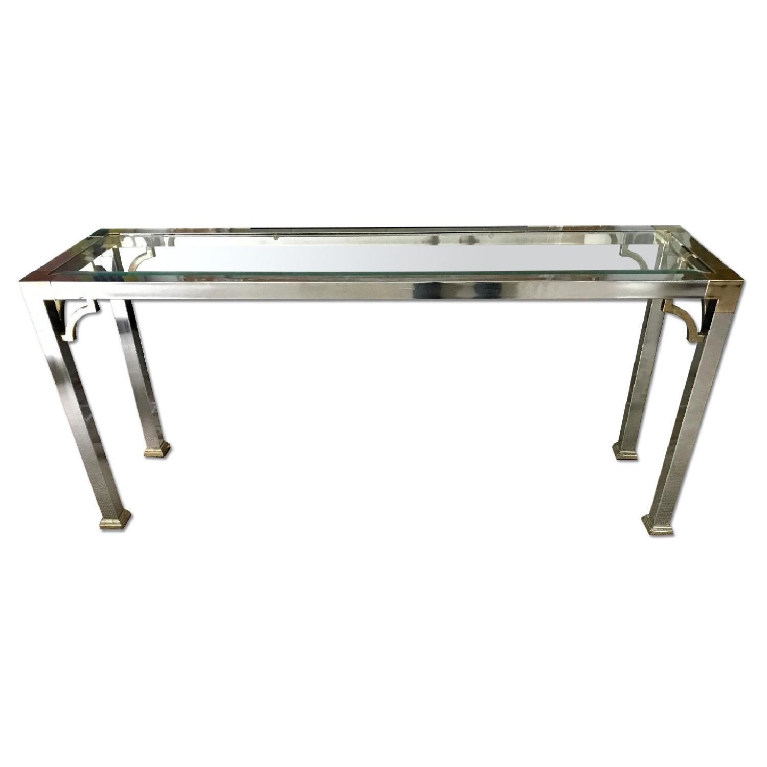 Seller's Notes:Stylish Maison Jansen style chrome and glass console table. Wonderful brass detailing on the corners. Hollywood Regency appeal for your chic abode. Measures approximately 55" x 15" x 24 deep. Circa 1970's.