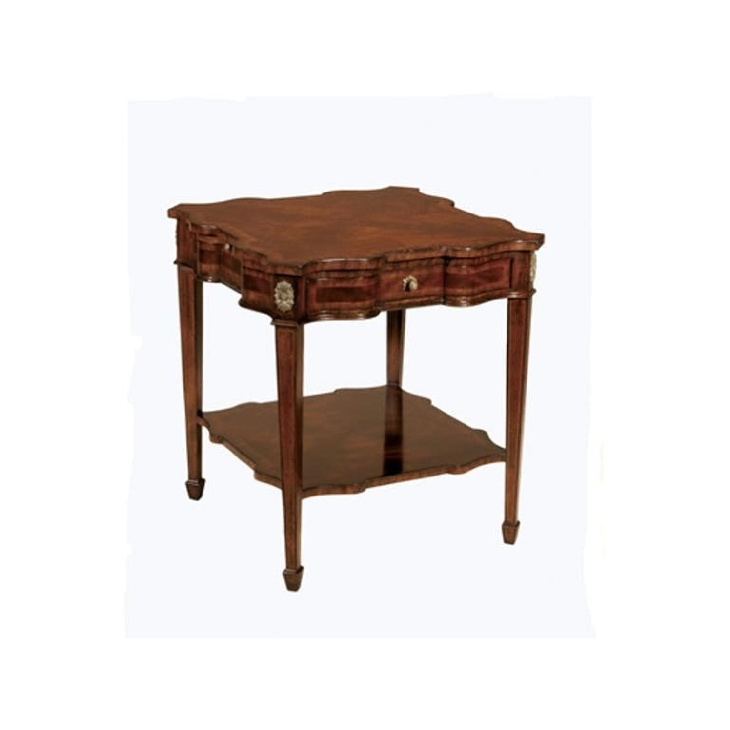 Seller's Notes:A beautiful wooden end table from design company Maitland-Smith. The table features two pull-out extensions, one drawer, and a bottom storage table. Other features include brass accents and sienna leather inlayed slides.