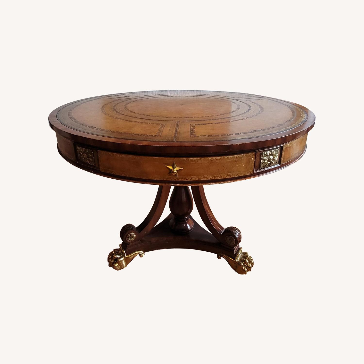 Seller's Notes:Dining/office/conference room/gaming table. Handcrafted. Maitland Smith, leather top. Ornate, Gorgeous Victorian-style decorative table with Clawfeet on Casters made from solid wood. Beautiful table! Nearly flawless, no scratches, scuffs, or damage of any kind. Minor wear is visible at the bottom edge, but that's it. No other wear is visible. The leather decorative elements are like new. The table top was and is always protected and cared for with proper care. Rolls freely. Pickup by professionals only to ensure proper care for a very fine piece.