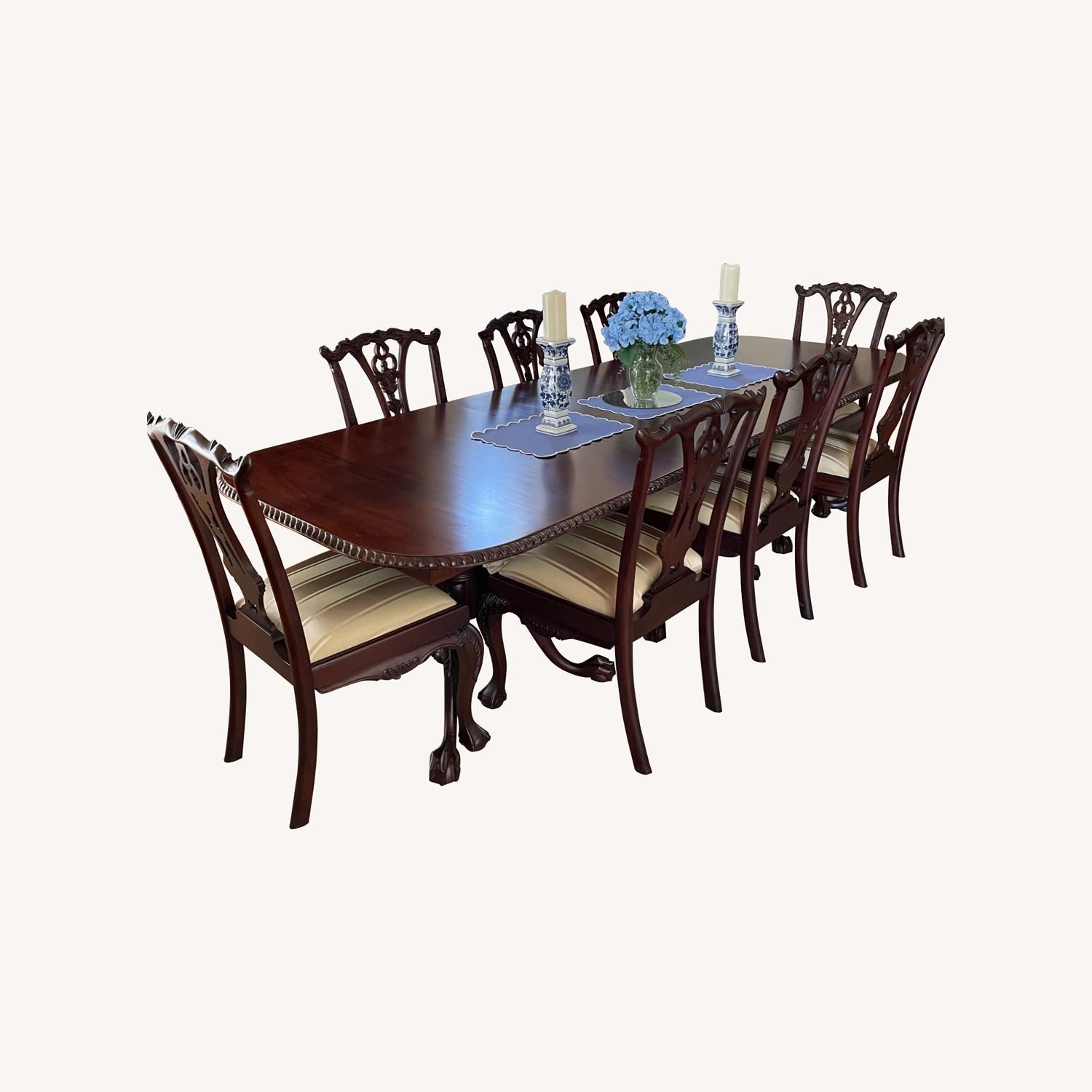 Seller's Notes:LARGE CONFERENCE or DINING ROOM 12 CHAIR Solid MAHOGANY Set. BALL & CLAW CHIPPENDALE STYLE. Crafted by renowned Fine furniture maker:: MAITLAND SMITH. Comes out of storage to be SOLD to that Exceptional Buyer who values QUALITY, Traditional Furniture. A knowledgable Buyer will surely appreciate the Value $$$ of this Incredible Set - Greatly reduced for a quick sale! Table Features a 3 Pedestal, Ball & Claw Base + extra extension leaf. Fully extended Measurements with leaf inserted: 136 1/2" L x 45 1/2" W x 28 3/4 Tall (without leaf 118 1/2" L). Rope edging on table is quite substantial (a fine repair on edging is identified....but difficult to notice) 10 Matching Side Chairs+ 2 Armchairs are covered in a Gold Silk/Satin Stripe. All in Very Good, Sound Condition. (minor spots on a very few chairs will likely was off). A good compounding polish will bring out the true beauty of this INCREDIBLY BEAUTIFUL SET that YOU will be Proud to showcase in your Conference Room or Stately Dining Room.