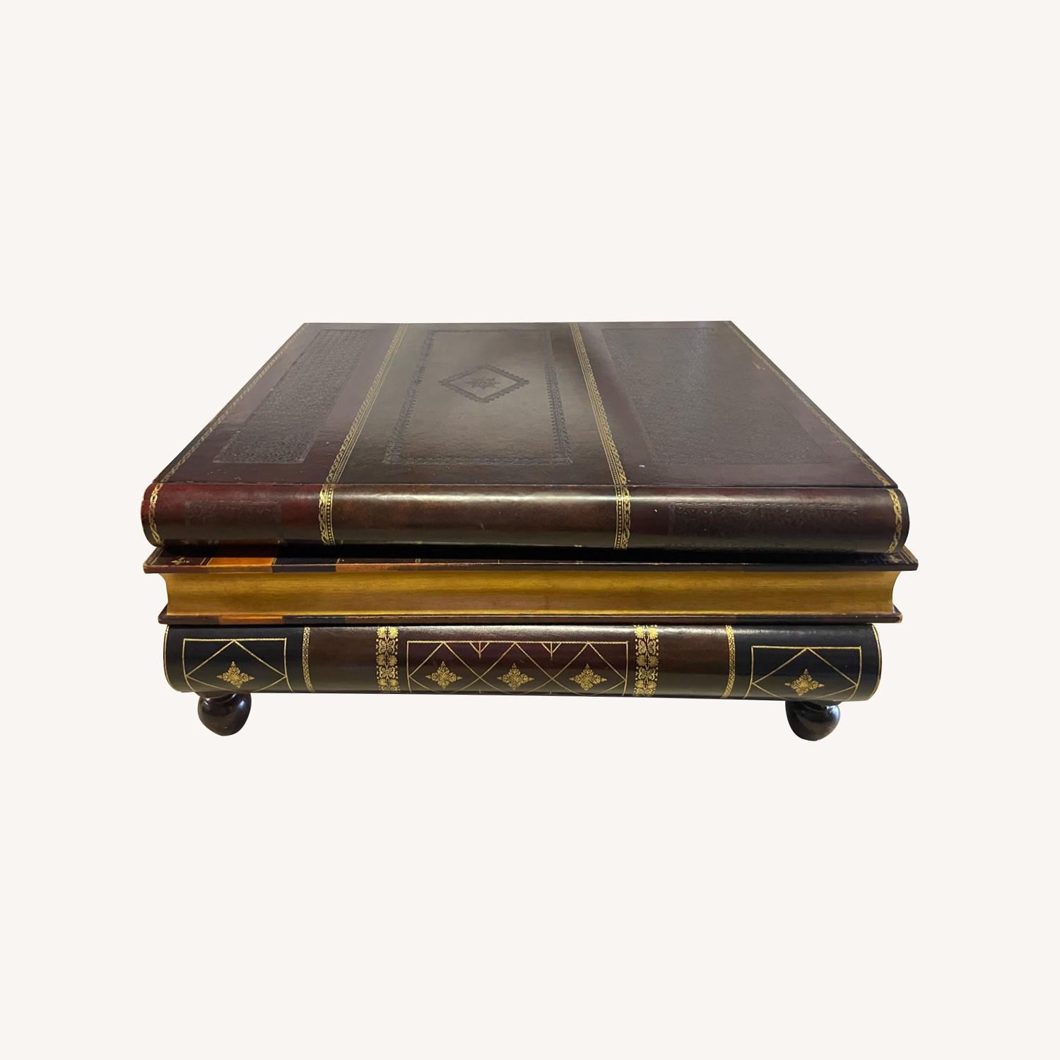 Seller's Notes:Maitland Smith stacked books coffee table. Leather embossed and guilded books, 3 lined drawers concealed in the spines, Sides are coated in gold leaf.