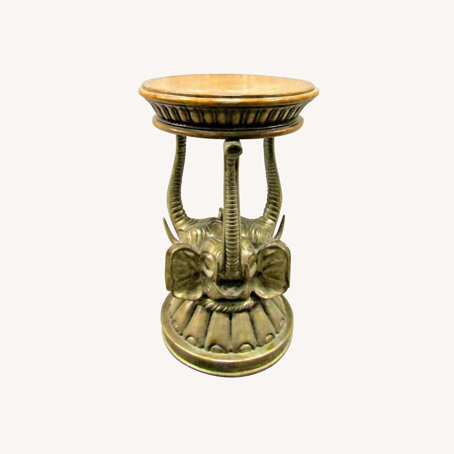 Seller's Notes:Maitland-Smith Three Elephant Heads Lotus Blossom Base Leather Top Side Table Resin base and wood/leather top side table having an Asian style three elephants head motif with trunks pointed upward design completed with a stylized lotus blossom form base. Measures 19 3/4" diameter and 32" tall. The table weighs 32 pounds, 2 ounces.
