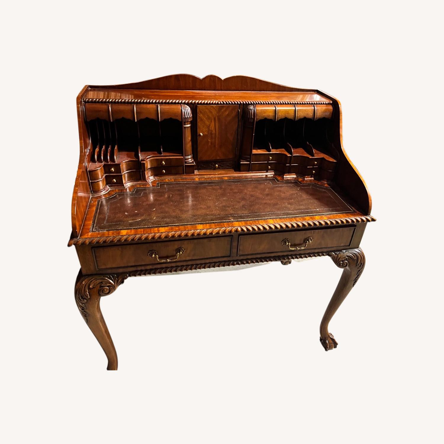 Seller's Notes:Maitland Smith antique reproduction leather top writing desk with drawers, brass pulls, claw feet, and hidden compartments. Some scratches, gently used.