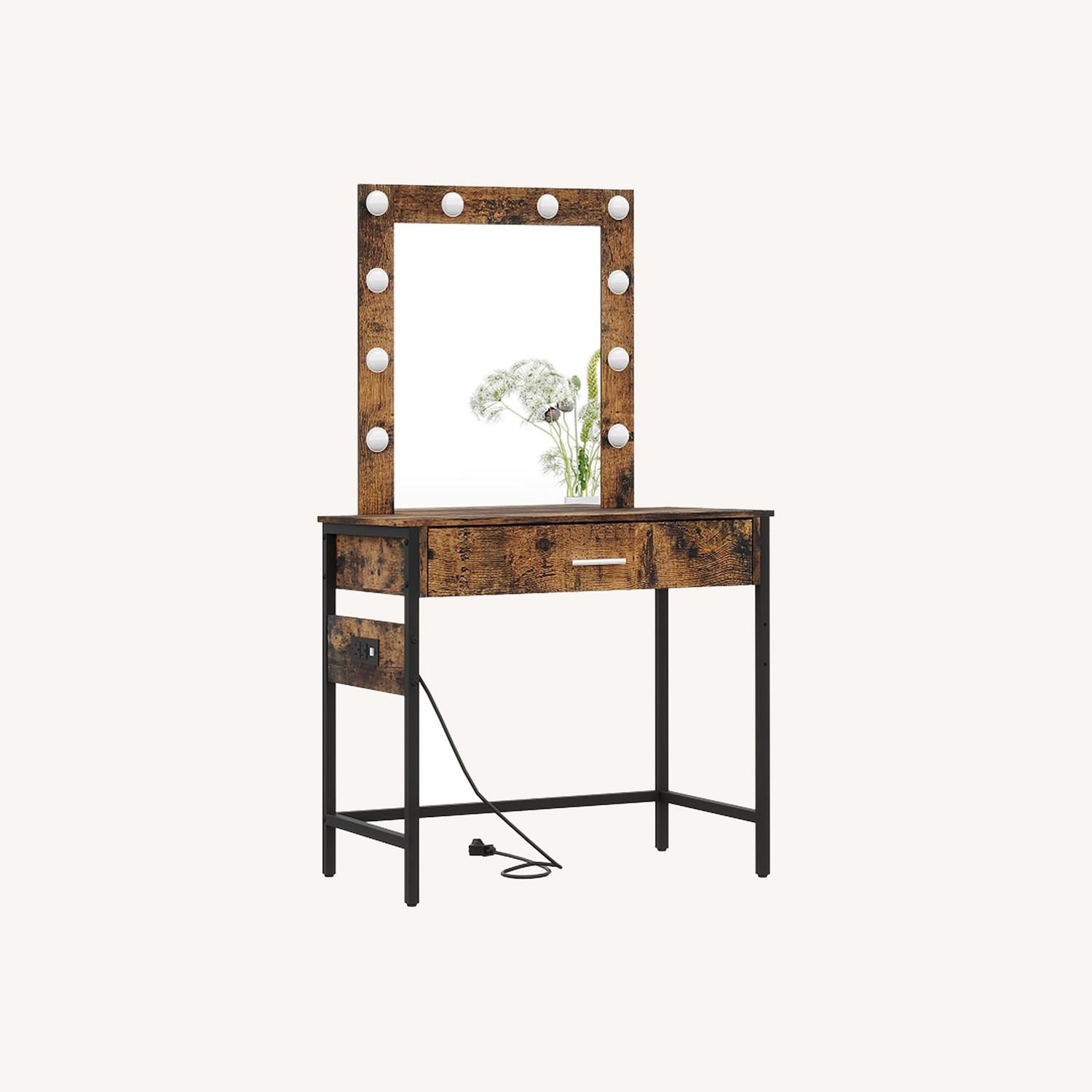 Seller's Notes:Makeup Vanity with Charging Station: The charging station is equipped with 2 standard plug outlets and 2 USB ports. Adjustable Brightness: Equipped with 10 dimmable LED lights. Classic Industrial Style: With a sturdy black metal frame paired with high-quality particleboard vintage finish.