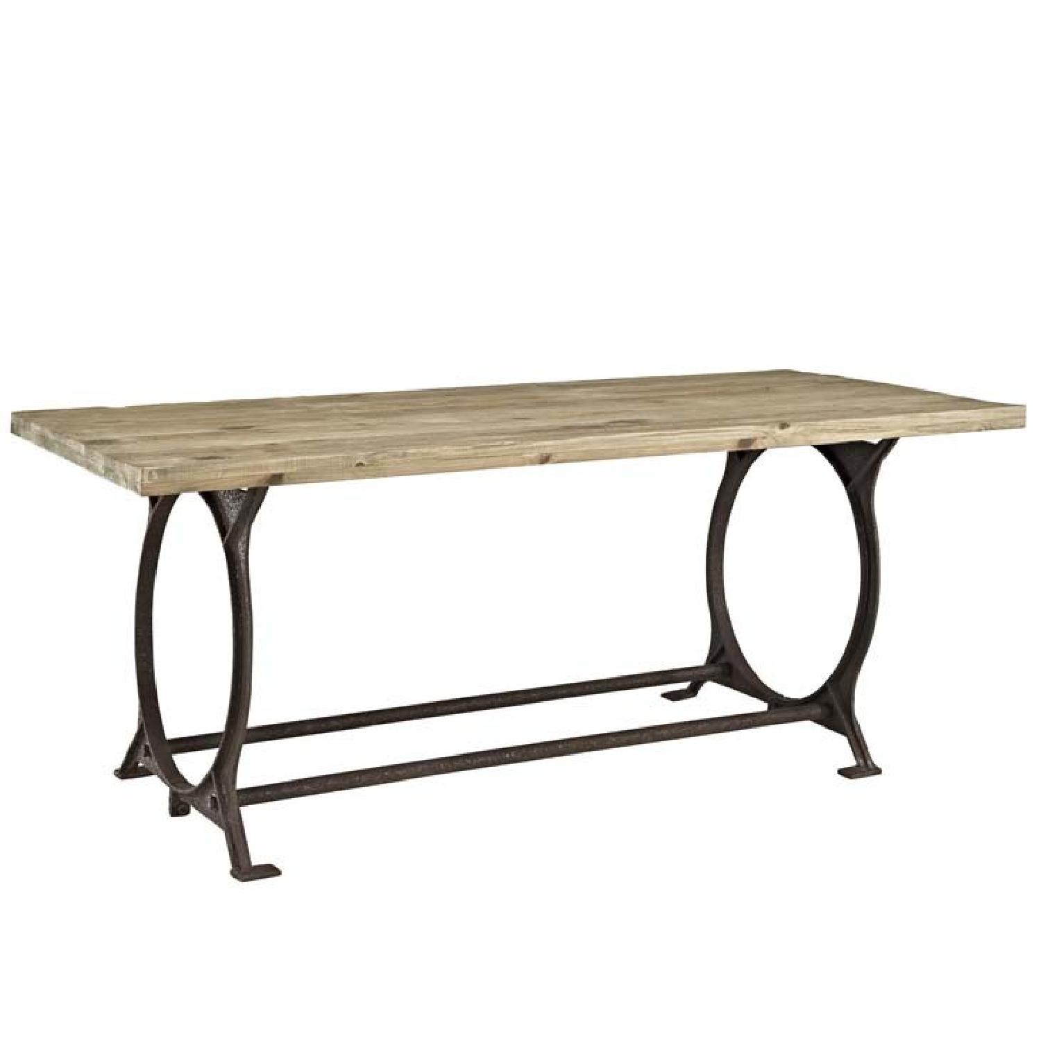 Seller's Notes:Instill lasting memories with the Effuse industrial modern dining table. Fashioned with a cast iron base and solid pine wood top, Effuse could easily be confused with a draftsman's table. But on closer inspection, this rustic piece becomes appreciated as an artisan’s symbolic rendering of the industrial age aesthetics.