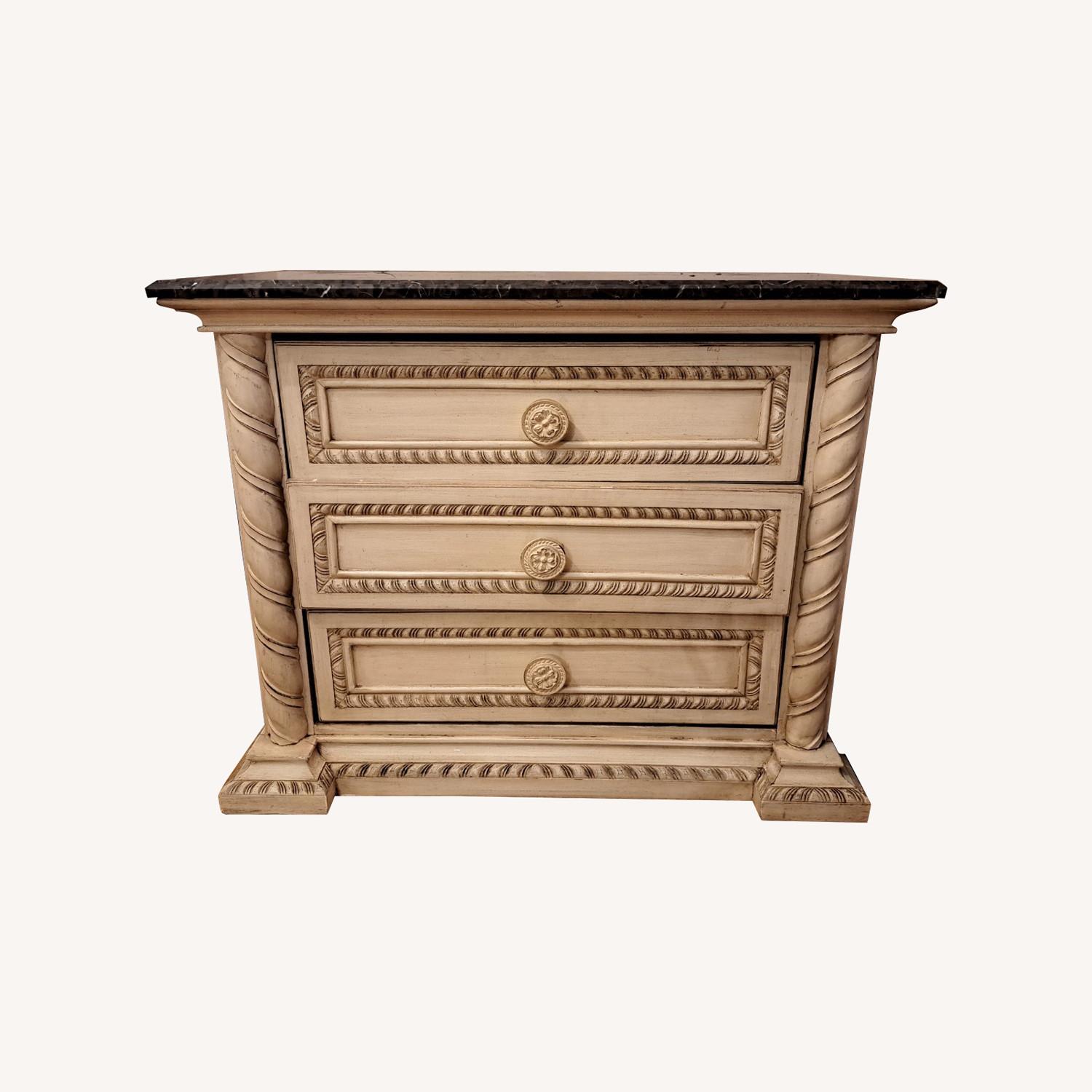 Seller's Notes:It's a nice drawer I bought it in antique storegreen marble on top its faded cream color 3 large draws There is a very small crack on the right corner otherwise it's in ok condition