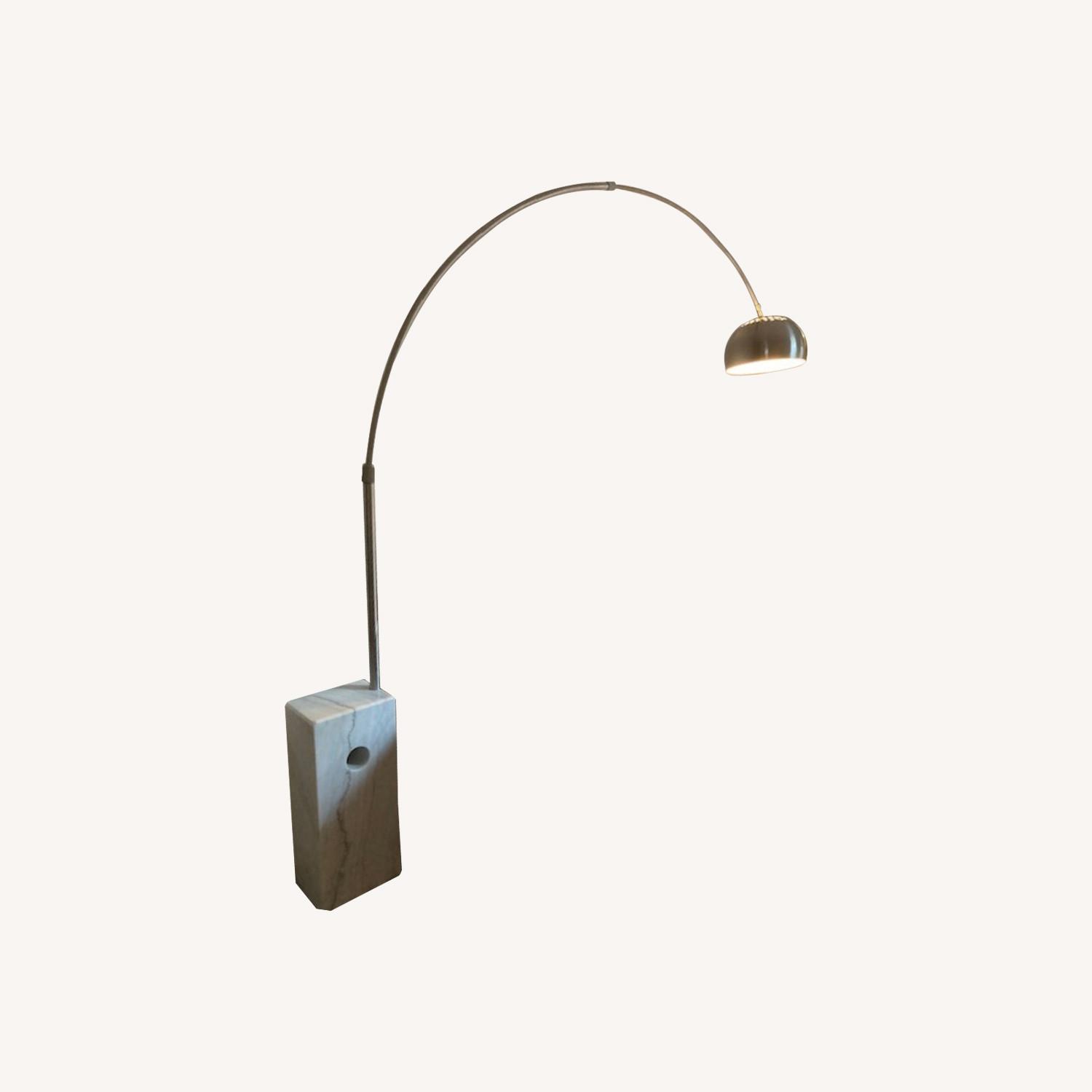 Seller's Notes:Arco-style Floor Lamp with Large Marble Base. Product is a high-quality reproduction of the original. Features a brushed-chrome shade with a tubular stainless-steel arc and a heavy white polished marble base. Adjustable height.