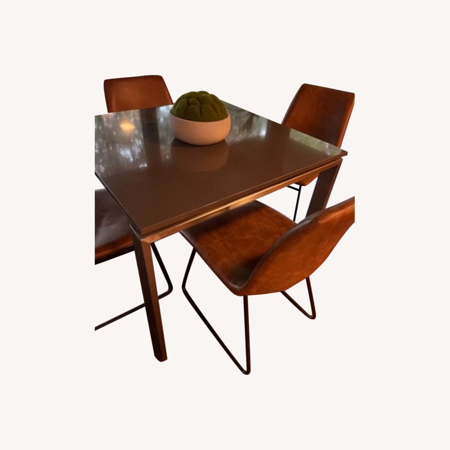 Seller's Notes:Brown/grey marble with silver metal base. The marble sits atop the base giving it a modern look. 4 faux leather modern chairs. Black metal base. 2 chairs have some metal wear on the base.