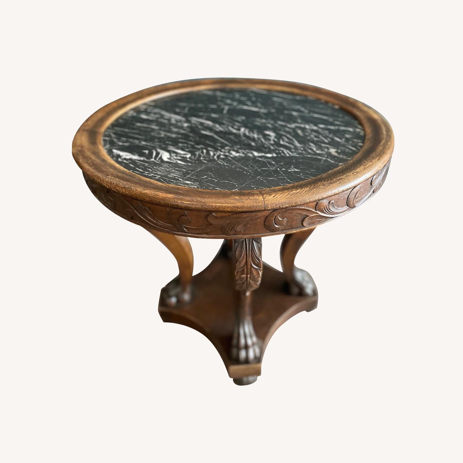 Seller's Notes:Beautiful Black Marble Top Side Table with Hand Carved Wooden Legs. Unknown age or maker, sourced from a home in Aspen Colorado. Great condition.