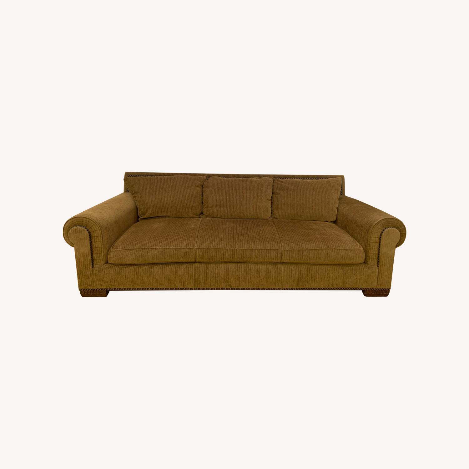 Seller's Notes:Beautiful large 9 foot Marge Carson sofa that can sit at least 5. No rips, stains or tears. The seat of the couch is one long cushion with straps and clasps underneath. Metallic stud finishes on the arms and borders.