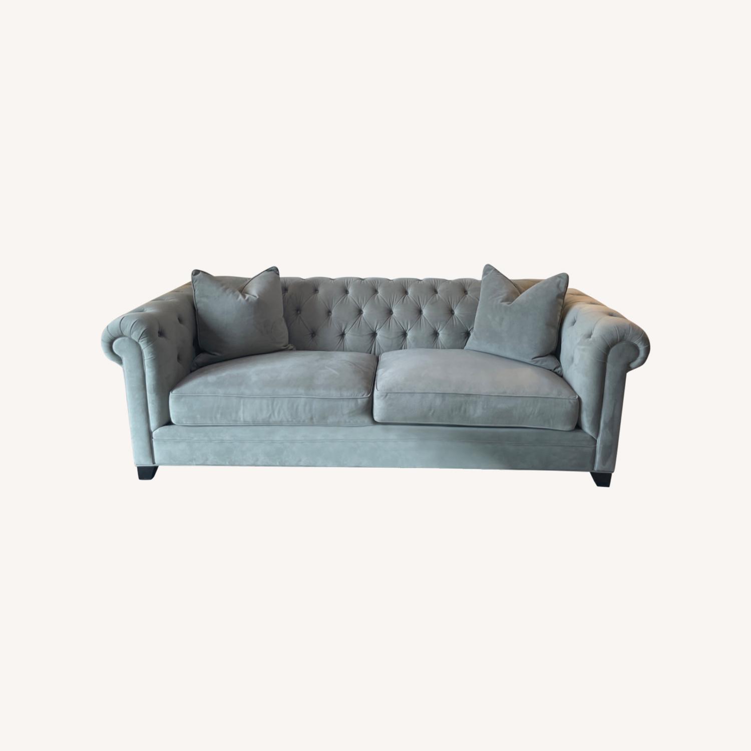 Seller's Notes:Lovely Martha Stewart light green- gray diamond tufting and lush velvety upholstery. Rarely used. Very good condition.