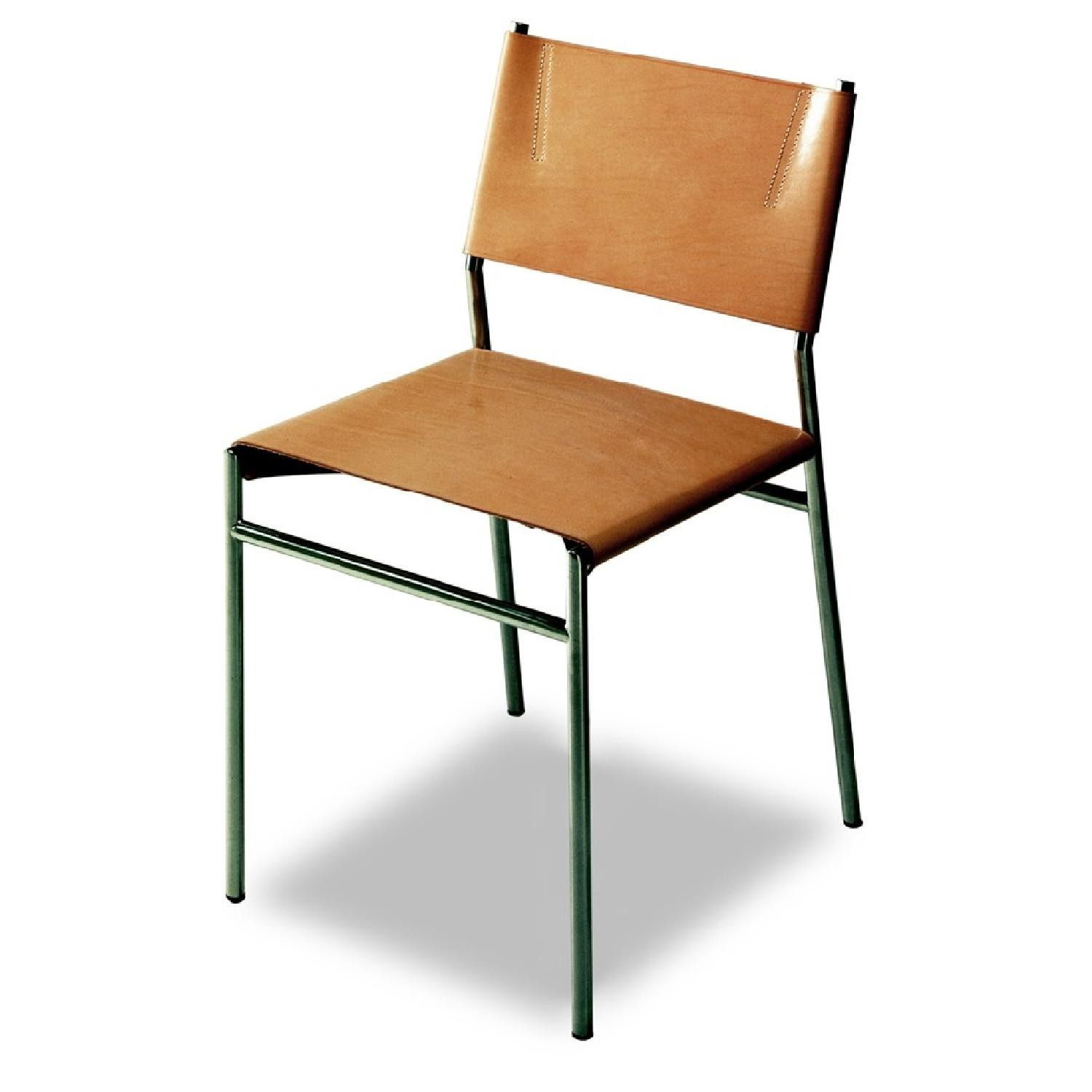 Seller's Notes:The dining chair SE 06 was designed in 1960 by Martin Visser. Current retail price is $1290 each. The frame is matt chrome-plated—seat and back is undyed (not treated) saddle leather. GREAT for someone who appreciates the look and feel of natural sturdy leather that shows wear. (Leather will continue to darken to a cognac color over time. Staining and small scratches are visible.) Saddle leather will also stretch a little over time. Any marks on the leather should not be considered as faults. These merely confirm the authenticity and quality of saddle leather. The leather seat has a lace at the bottom, which gives the possibility to tighten the seat after a while. We love these chairs but unfortunately, moved and have no room.