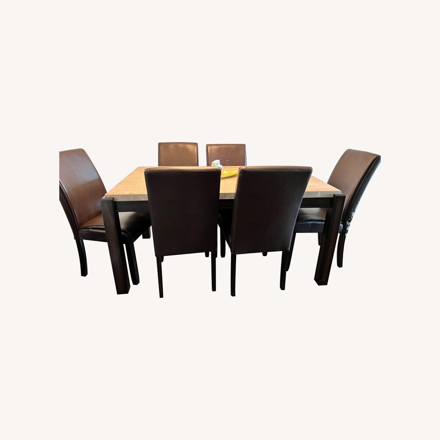 Seller's Notes:A gorgeous marble and dark wood dining room table in excellent condition! Currently wrapped and disassembled for ease of transport and delivery!