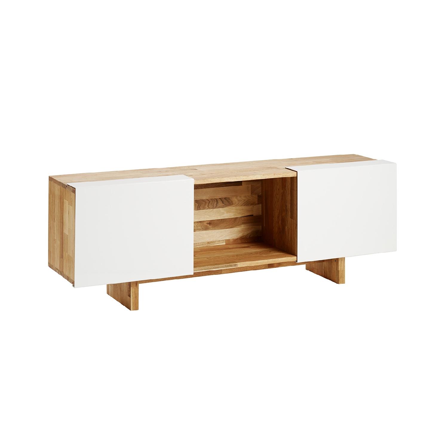 Seller's Notes:Well-made solid wood credenza / media stand by MASHstudios (LAXseries line). Perfect storage for 12" records / record player (see picture in my home) or books or as a TV stand. Very good overall condition with small splits along wood grain (from dryness) but no structural defects. Materials: Cabinet case - Natural oil finish, Solid English Walnut Doors - White Aluminum sliding doors