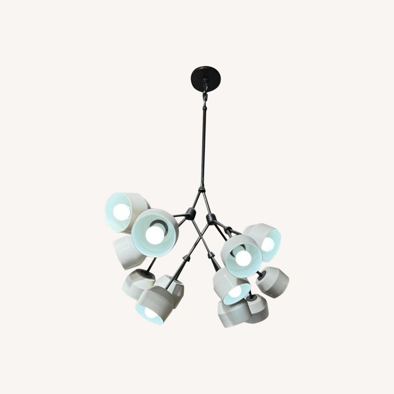 Seller's Notes:Twelve light Materia Forchette chandelier with blackened brass and white porcelain shades This beautiful chandelier was at my store in Brooklyn for last 4 years. I'm remodeling and am using a different light fixture. Great find for someone. It's a pretty easy install and not too heavy. All the details can be found here https://www.materiadesigns.com/forchette-chandelier