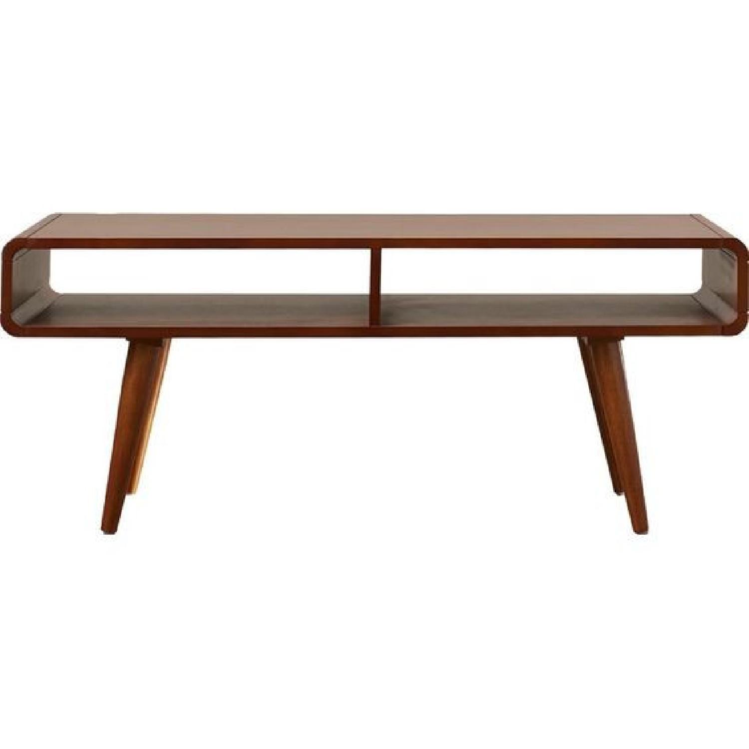 Seller's Notes:We're selling our BRAND NEW, JUST-OUT-OF-THE-BOX Mccurley Coffee Table from AllModern! It's a great table - we simply misjudged the measurements of our space and unfortunately cannot make it work. AllModern description below - we'll sell for $250 w/ pickup or $275 to include delivery (happy to drop off anywhere in Brooklyn or Manhattan). It's fully assembled but can be broken back down if need be. Description: Bring mid-century flair to any seating arrangement by adding this coffee table, an on-trend pick that's sure to grab glances. Crafted from solid and manufactured wood with a walnut finish, it stands atop splayed legs and sports rounded corners. Two lower compartments offer space to stash books or stage a display of small-scale decorative accents, while the top measures 24'' W, leaving enough room for coasters, TV remotes, and more. Full assembly is required upon arrival. Less