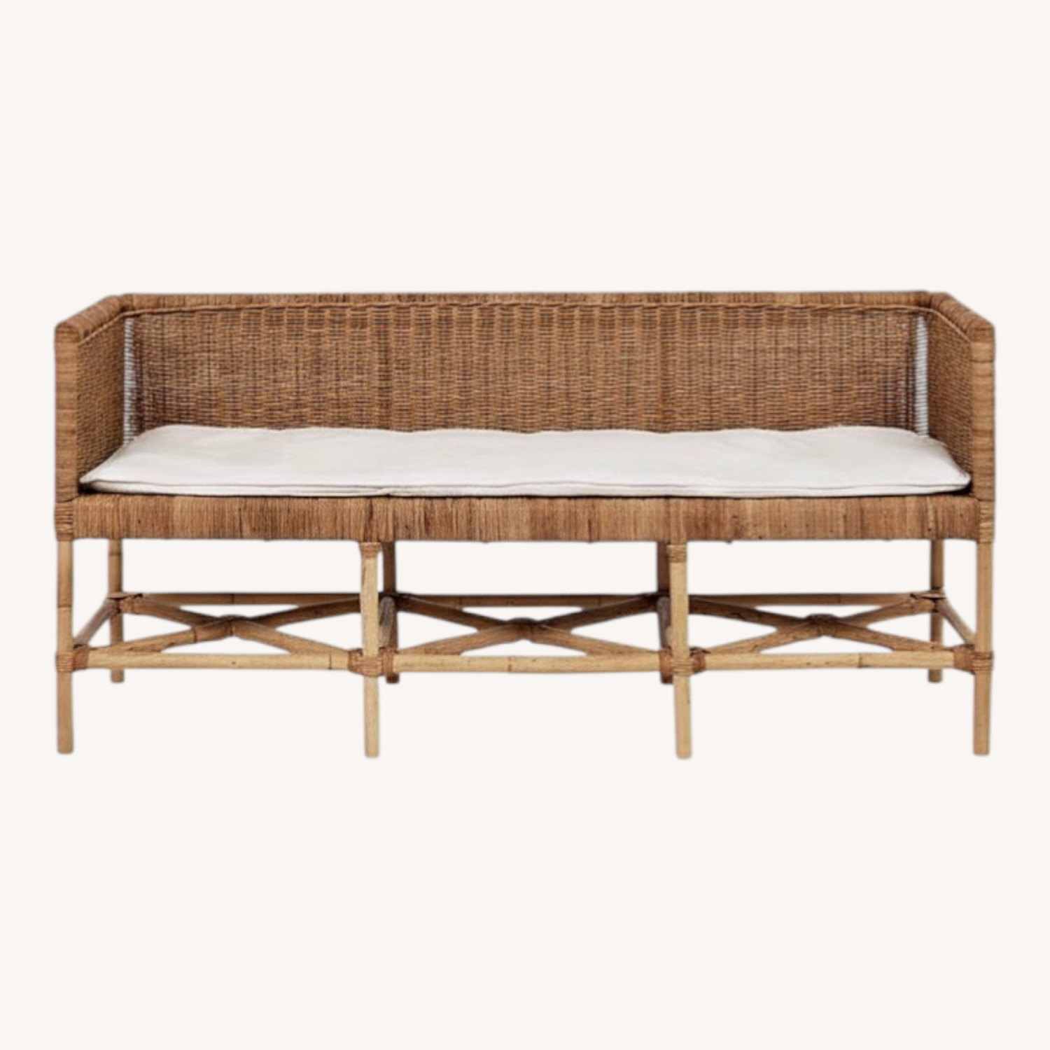 Seller's Notes:Natural Rattan Brown Cloud White cushion. The Odelia Bench brings textural dimension to your space. Its natural material construction accentuates its organic and airy frame, as a performance fabric pillow is comfortable while withstanding everyday life. Minor pulls on button of pillow. No damage to bench.