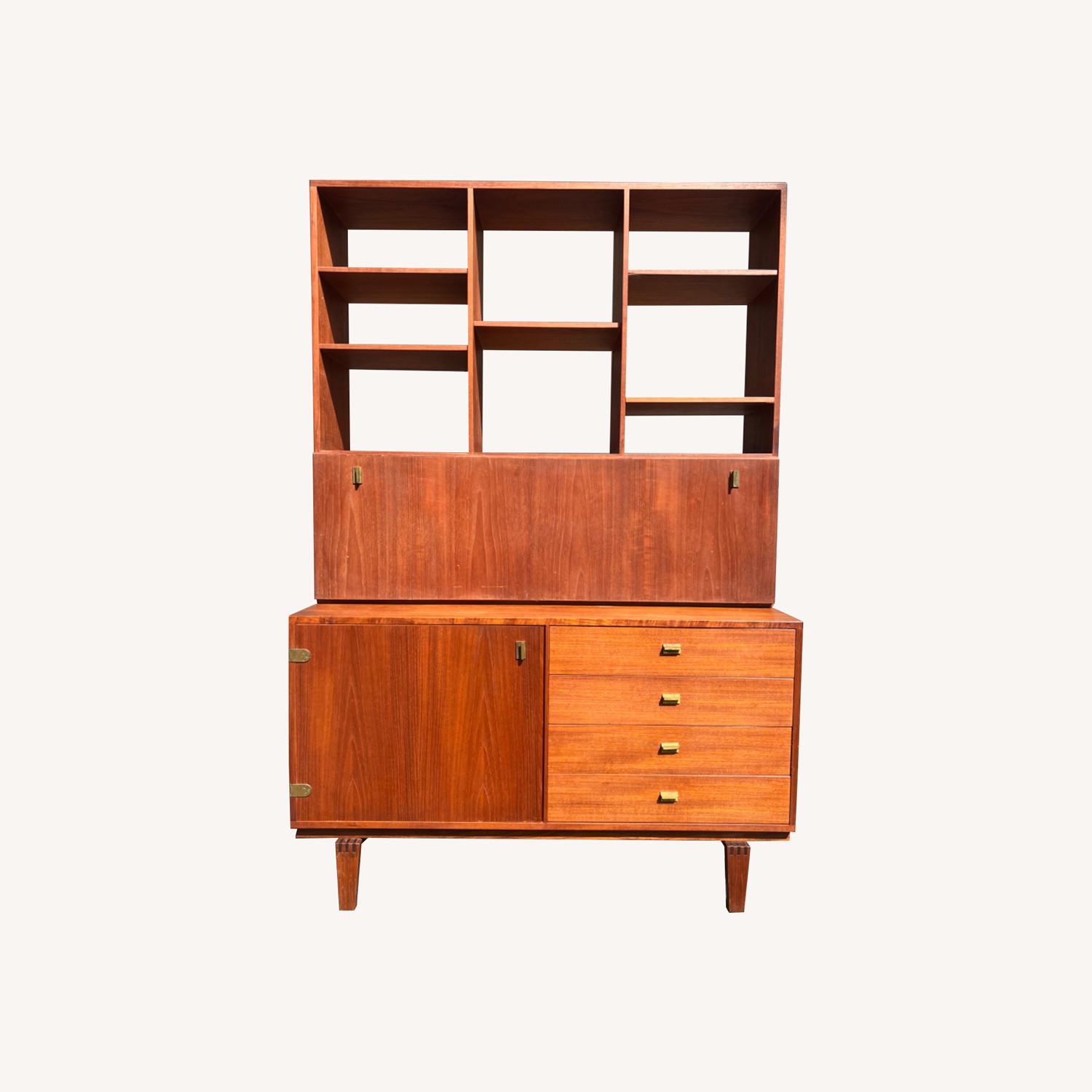 Seller's Notes:Beautiful mid century Danish modern credenza with flip down desk and shelf unit designed by Lovig for Dansk. Nice flip down desk area with cubbies and drawers. Teak upper unit with shelves on top of lower teak credenza with one cabinet door and 4 drawers with brass hardware. Made in Denmark. Current condition : very good, some minor scratches on credenza top and one water stain, both units have had the back panel removed. The top shelf unit back is included and detached.