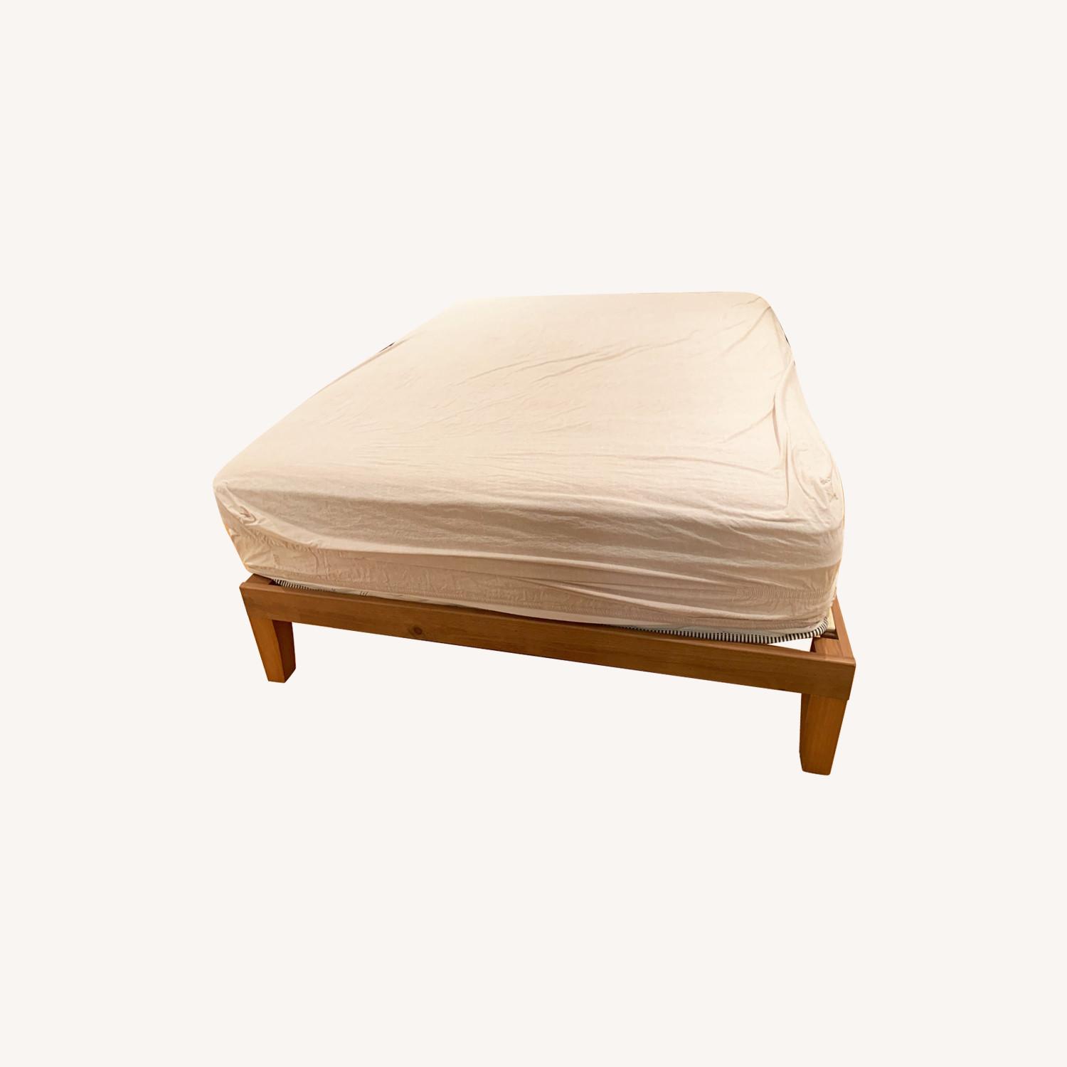 Seller's Notes:Rustic pine finish, solid wood slatted bed frame. MCM style. Purchased this a year and a half ago and I've decided to get a larger bed. There are no issues, perhaps some very slight wear but I've taken good care of it! Full size. I also have a 13" memory foam mattress which was bought at the same time, always used with a mattress protector and shows no wear. Photos show it with freshly laundered sheets and mattress protector over it. Would be happy to include free of charge.