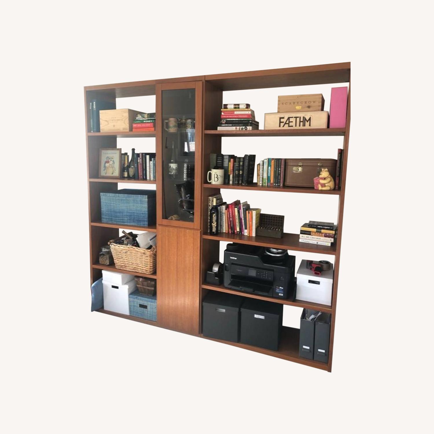Seller's Notes:Vintage from the late 80s; solid teak wood. Moving and do not have the space for it - sad to see it go. Light box feature in center 87in wide, 87in tall, 16in deep The unit disassembles into side panels, shelves, and the center cabinet. Some scratching (see photo) and missing footers on left side (currently using felt pads instead)