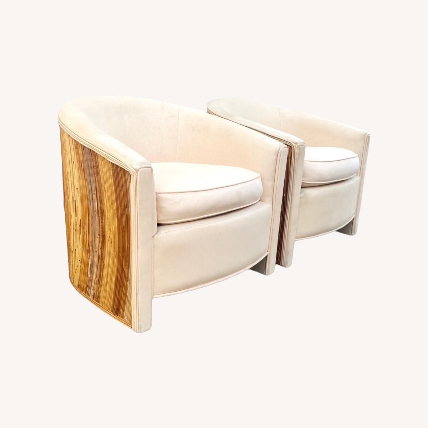 Seller's Notes:1970s Vintage split reed club chairs by Gabriella Crespi. A rarity to find a set like this all together. Figural bamboo work moves across these chairs and creating a statement set for your mid century modern home Measurements: Chairs: Height: 26” Width: 27.5” Depth: 26.5” Seat Height: 18.5” Condition: Upholstery has been professionally cleaned; it does show slight fading/color differentiation when looking closely.