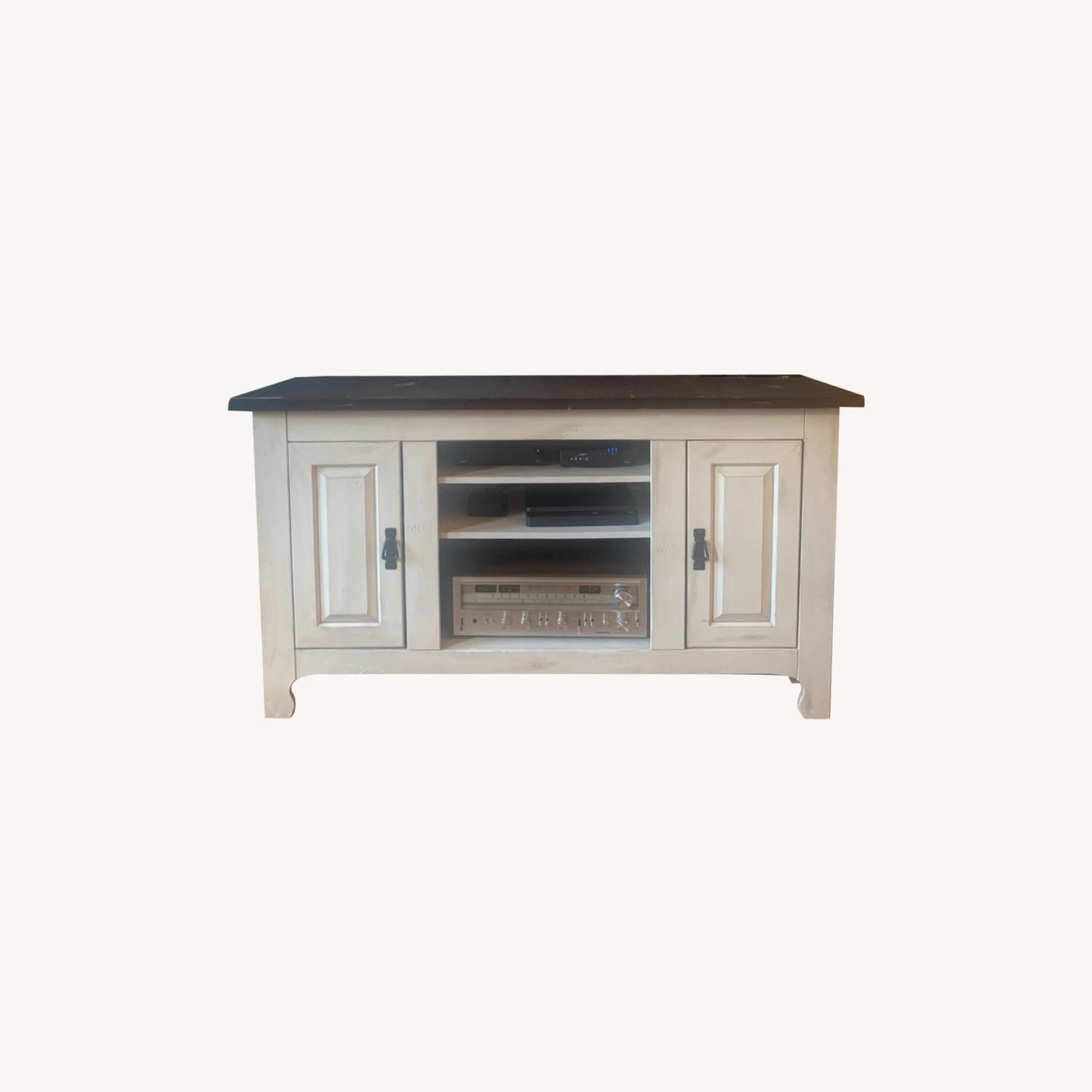 Seller's Notes:Great Quality Media Console- dark wood top, and distressed finish to a cream base. Two storage cabinets that fit quite a bit into it. It is a very sturdy piece, no blemishes to it.