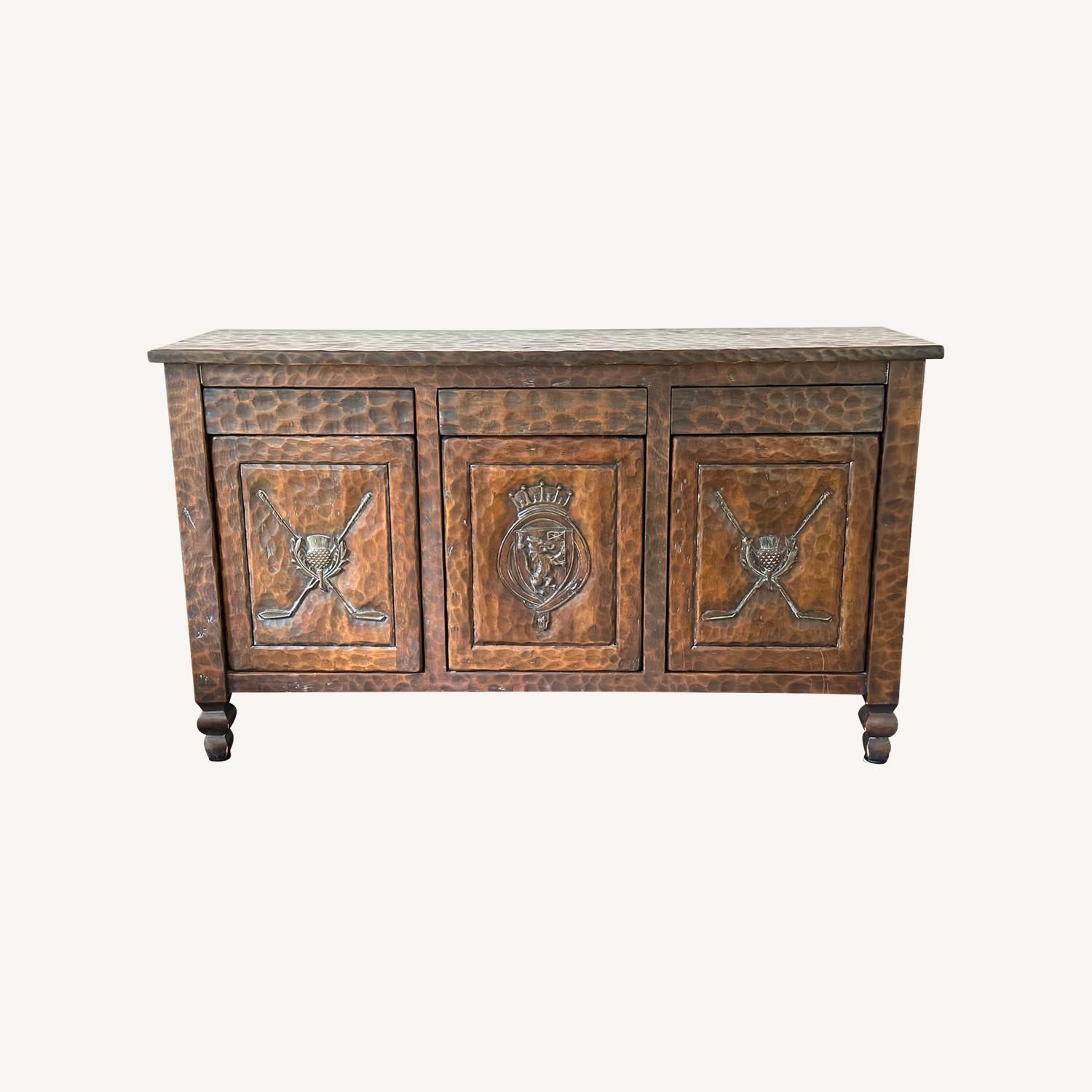 Seller's Notes:For the golf enthusiast! Media console table with sophisticated golf etchings/details. Three small drawers on top. Three push open cabinets underneath. Cabinet shelf heights are adjustible. Middle cabinet includes a hole in the back for cables/wires. In very good condition. Matching wall mirror to come under separate listing. Includes phrase "Far and Sure".