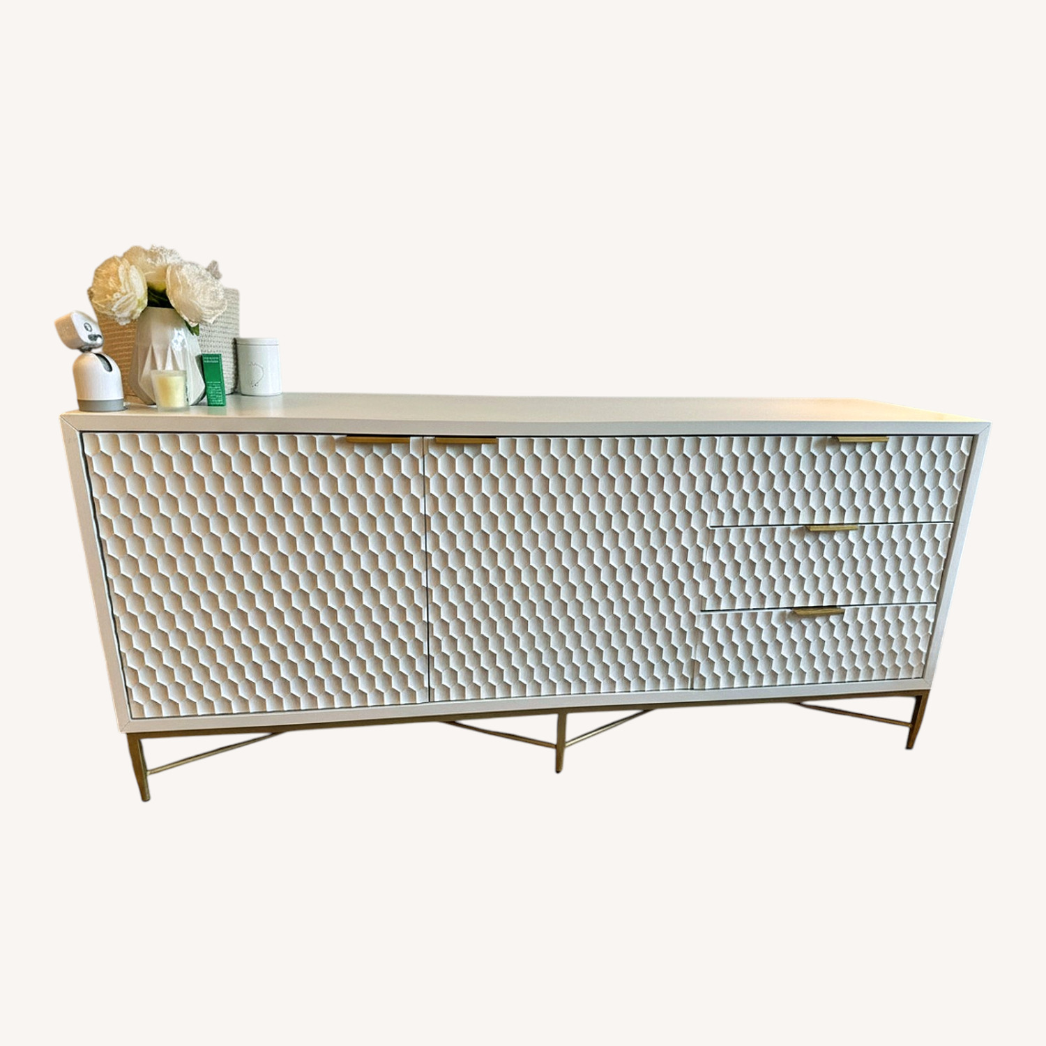 Seller's Notes:Media console with lots of storage. 2 doors open for 2 shelves each and 3 drawers as well. Small discoloration on top, in good condition.