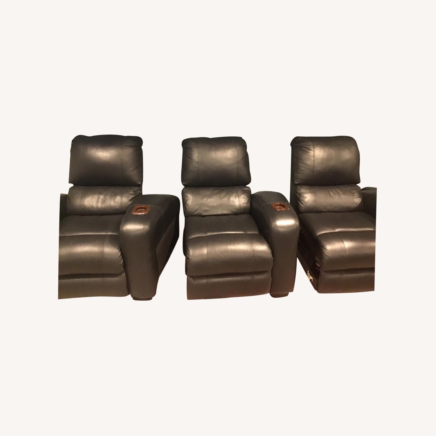 Seller's Notes:Media Room reclining chairs that interlock, in good condition. No stains, minor scratches. Retails for over $1,000 for the set of 3.
