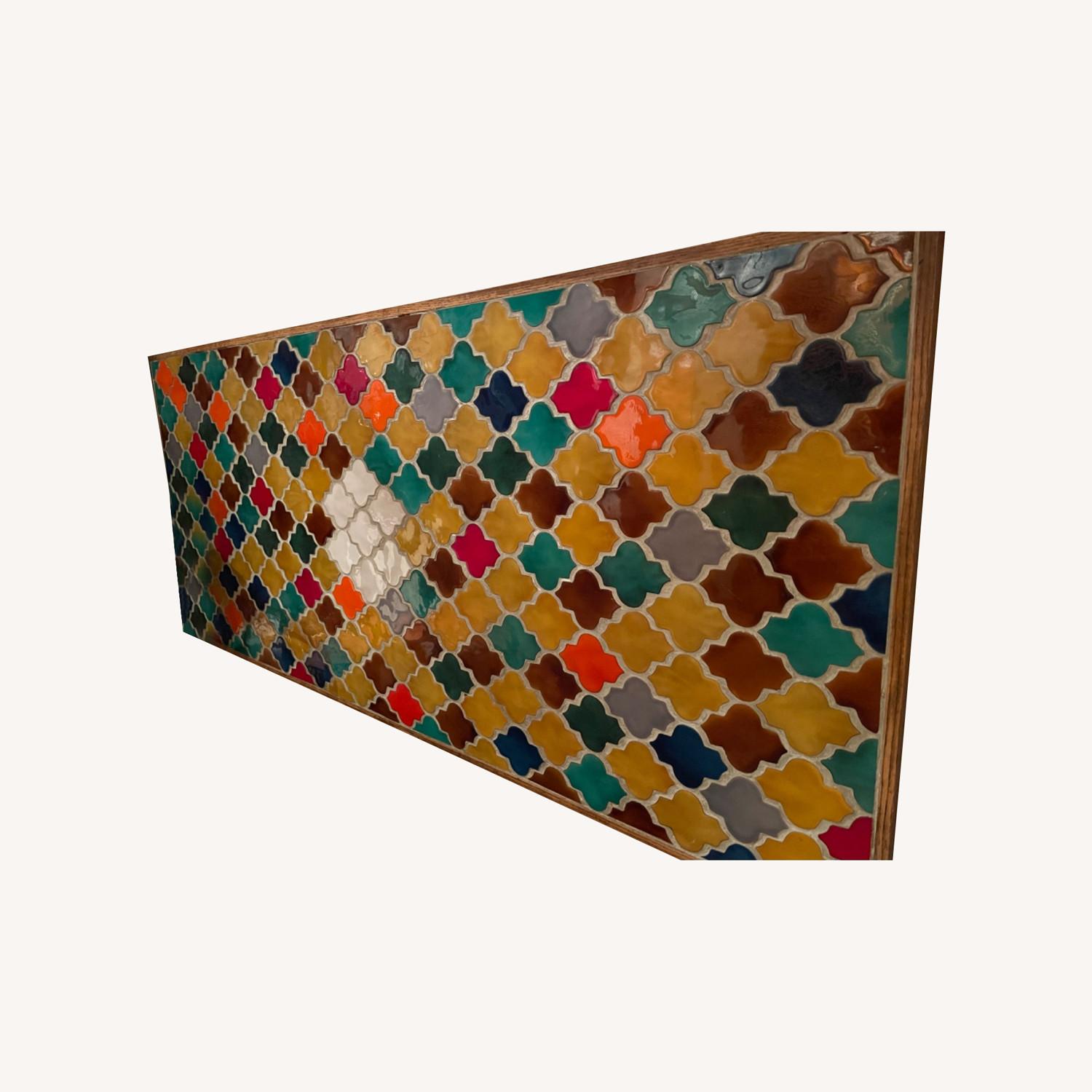 Seller's Notes:Heavy tile table top can be paired with your choice of sturdy base. Multicolored tiles with oak frame. One spot where cement is missing, one wood splinter at a corner edge.