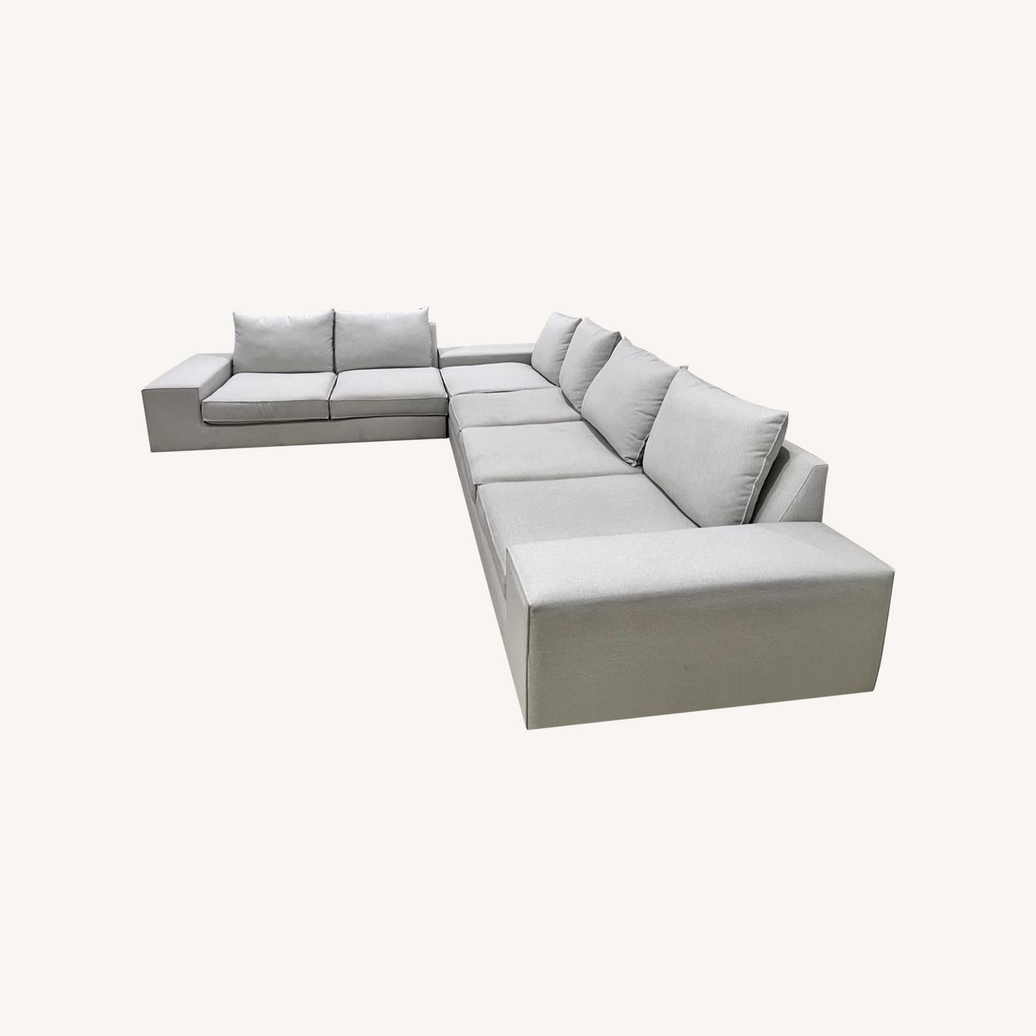 Seller's Notes:Ultra loungy Blumen Corner Sectional features plenty of leg room and wide arms with piping for a tailored look. Handcrafted in the USA and made to order for flexible styling options. Cushions: Padded frame and loose seat cushions made with highly durable and soft CertiPUR-US®️-Certified poly foam. Frame: Constructed with a blend of solid wood and engineered hardwood for added stability. All loose back pillows and seat cushions are flippable and feature removable zippered covers for spot cleaning. Oyster fabric is machine washable. How it Sits: Deeper seat and lower frame for extra cozy lounge vibes. Texture Oyster Fabric: A subtly textured, durable fabric woven with recycled yarn. Pile on the fam and friends: Texture’s innovative composition features a plant-based water repellent to help guard against spills and stains. Content: 73% Repreve Polyester / 27% Virgin Polyester Certification: GREENGUARD Gold Rub Count: 100,000 double rubs Seat height: 13" Seat depth: 28" This is the older version of the Blumen couch that is larger with a lower frame. Very resilient seat cushions. Minor staining as pictured.