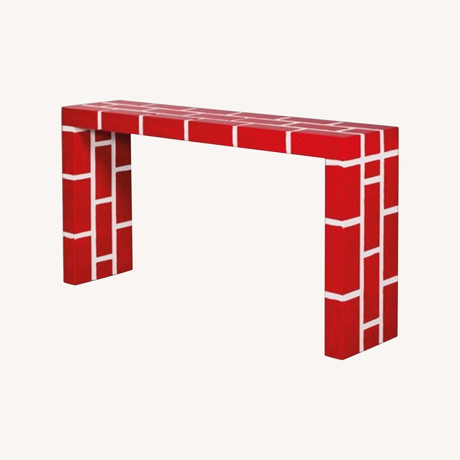 Seller's Notes:This Red brick table is a 1 of 1 limited edition piece and super rare. Collectible item from The red brick sculpture show in 2011. Inspired by Memphis, one of the most important cultural movements that took place in the 1980’s, is an initiative that was created by the late italian designer ettore sottsass. The pieces are made of ‘bricks’ constructed from wood, hand-carved and hand-painted red, reflecting the color of many traditional London buildings. Designer: Richard Woods Year: 2011 Sideboard in hand painted wood. This sideboard is realized in a limited edition of 10 pieces. Size: W 144, D 32, H 75 cm The product is purchased with authenticity certificate and guarantee stamp