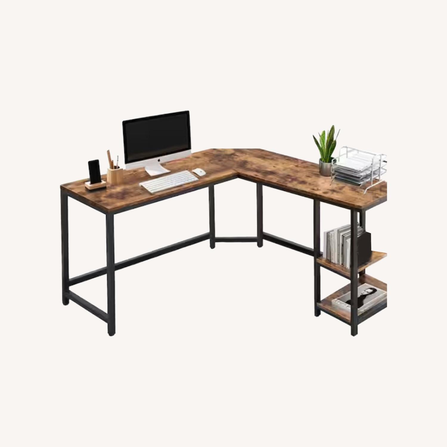 Seller's Notes:53.5 in. Industrial L-Shaped Computer Writing Corner Desk with 2-Shelves, fantastic for any work space that also creates shelf space minimizing clutter on the desk while working.