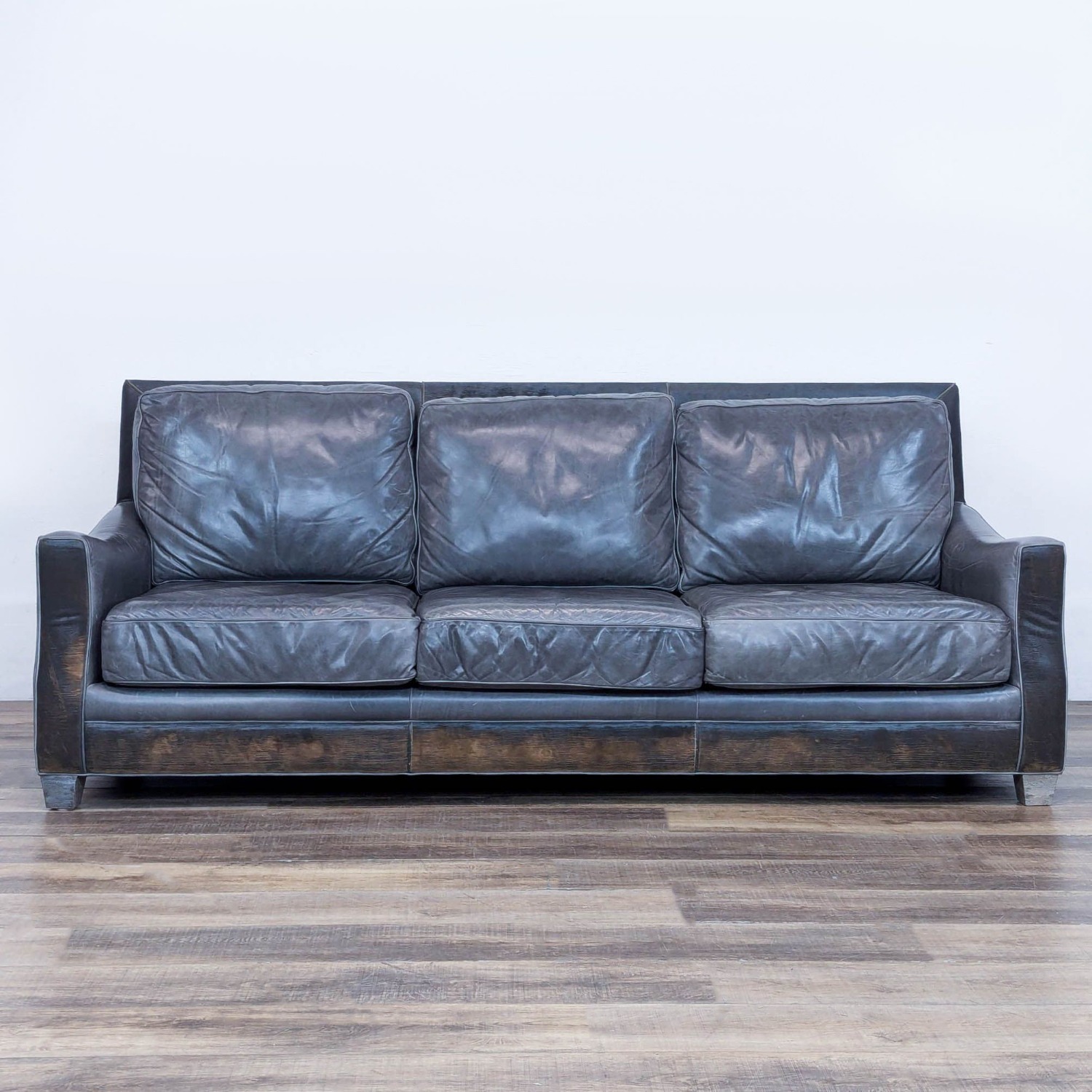 Seller's Notes:This Menlo Park Sofa features distressed leather with loose cushions and tapered wood feet.