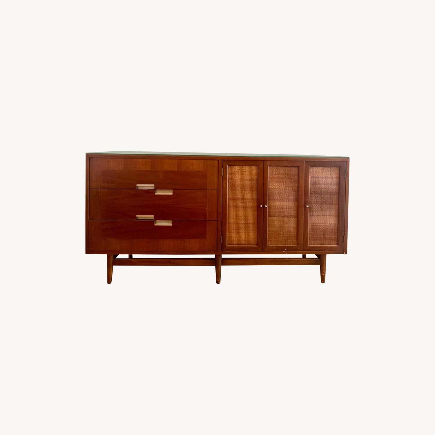 Seller's Notes:Vintage American of Martinsville mid-centery american modern Dresser/credenza circa: 1970s with six total drawers. Caned doors, metal pulls and inlay metal crosses on top with glass top. Merton Gershun for American of Martinsville.