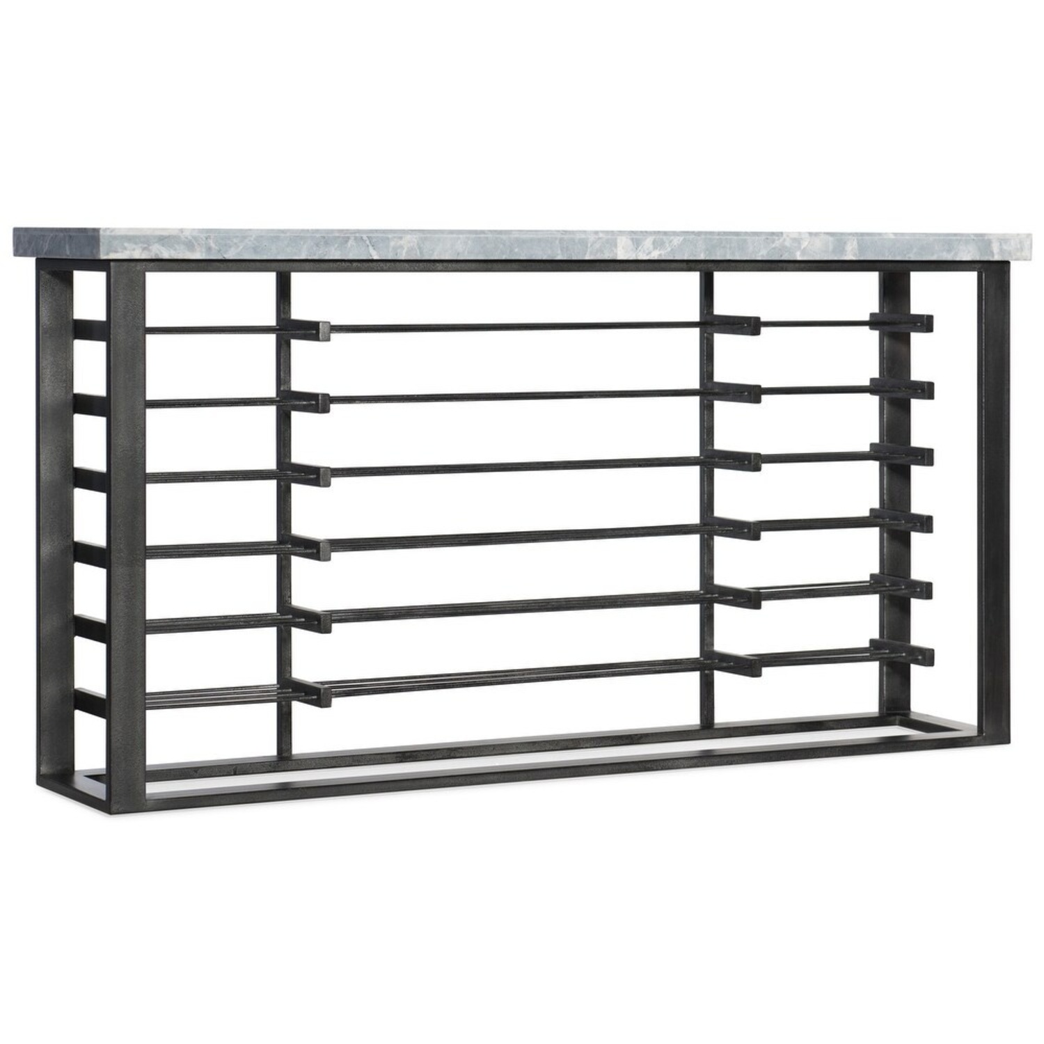 Seller's Notes:Modern wine rack console featuring a solid stone (marble-look) top paired with a black metal frame and integrated horizontal bottle storage. Designed to function as both a wine rack and bar console, this piece offers a clean, industrial silhouette while providing substantial storage for wine bottles and bar accessories.