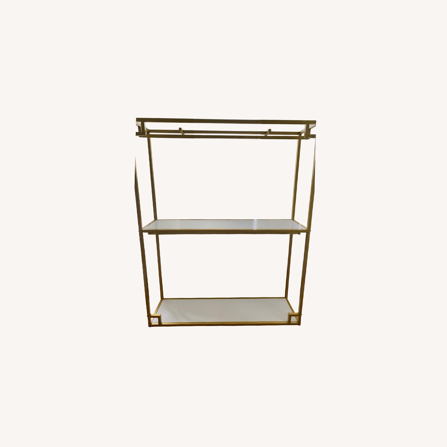 Seller's Notes:Double clothing rack. Shelves are white wood. Rack its is metal.