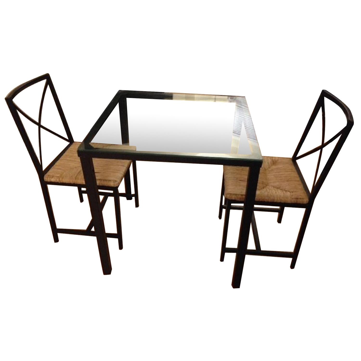 Seller's Notes:Black/glass top dining table and two black chairs with flax straw seats. Well kept and clean. Legs can be removed from table, easy to transport. Chairs are 16" x 16" x 34"