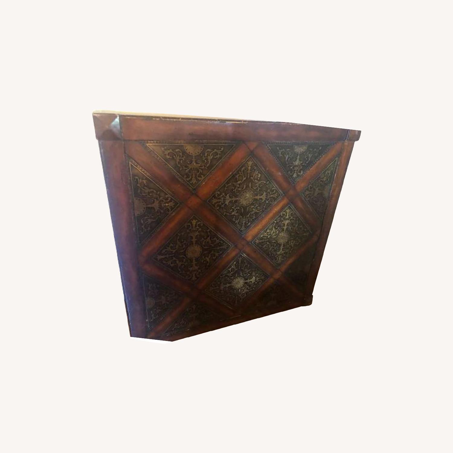 Seller's Notes:42x42x18 dark cherry wood stained coffee table with decorative metal inlays. Legs need to be stained to match table. Original legs were lost over the years. Does have wear and tear but could be stained and filled in by someone that knows how to restore. Beautiful large coffee table. I have loved it over the years but its just big for our current needs.