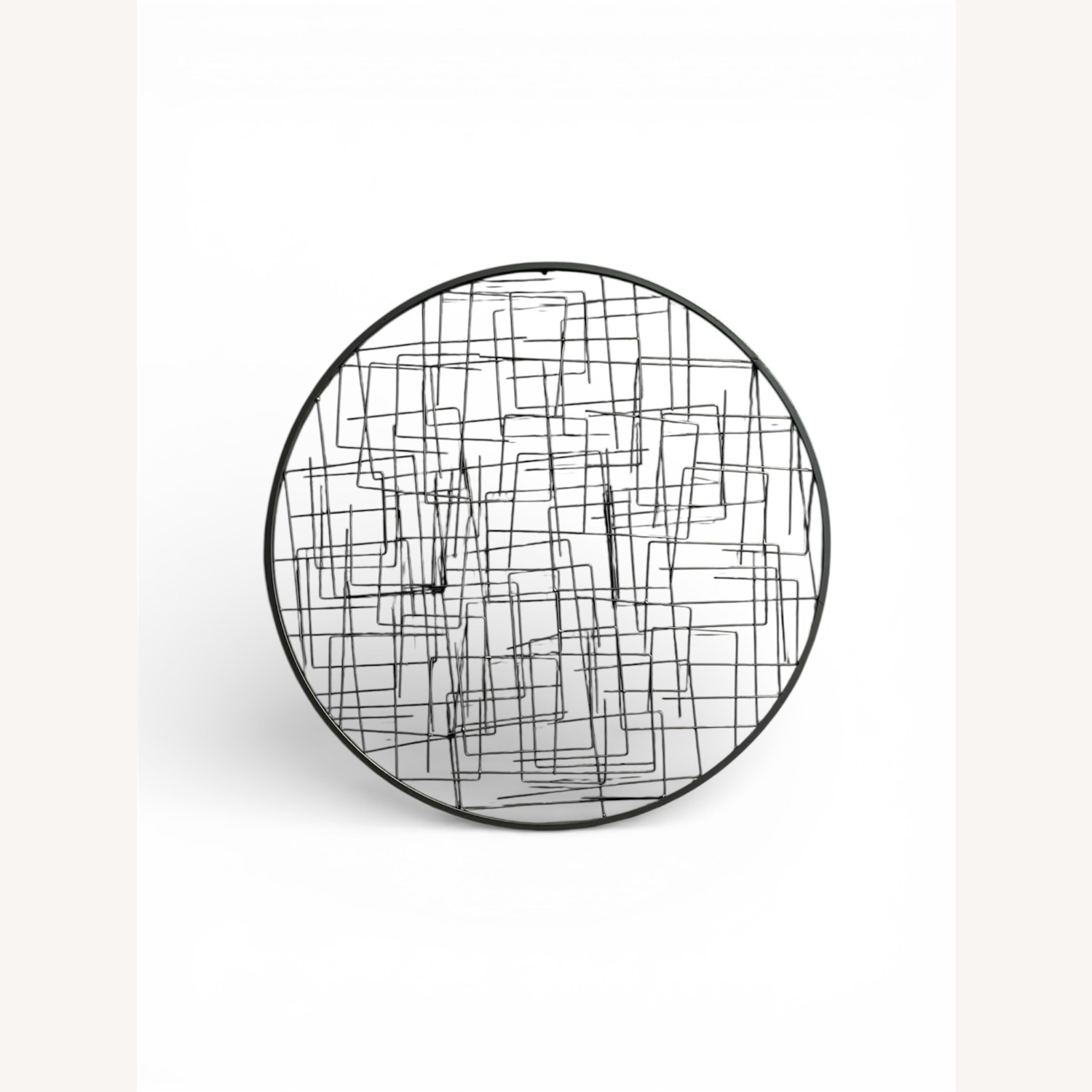 This striking wall art piece features an intricate, abstract design composed of overlapping geometric shapes. The circular frame showcases a dynamic arrangement of lines and rectangles, creating a sense of movement and depth. The black finish adds a modern touch, making it a versatile addition to a variety of interior styles, from contemporary to industrial.