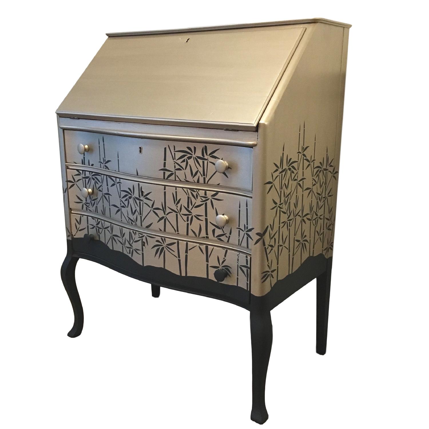 Seller's Notes:Recently refinished in our studio, this is an elegant one-of-a-kind hand painted vintage secretary desk is finished in a warm silver matte metallic with a pearlescent sheen. The bamboo design wraps around both sides and was hand painted in matte black creating a striking contrast against the metallic. This finish was inspired by seeing bamboo silhouetted against a shimmering pond at dusk. Inside the desk and the drawers you'll find a rich red that was custom blended in our studio just for this piece. Measures approximately: 29.5" wide 41" high 18" deep (closed) / 29" deep (open)