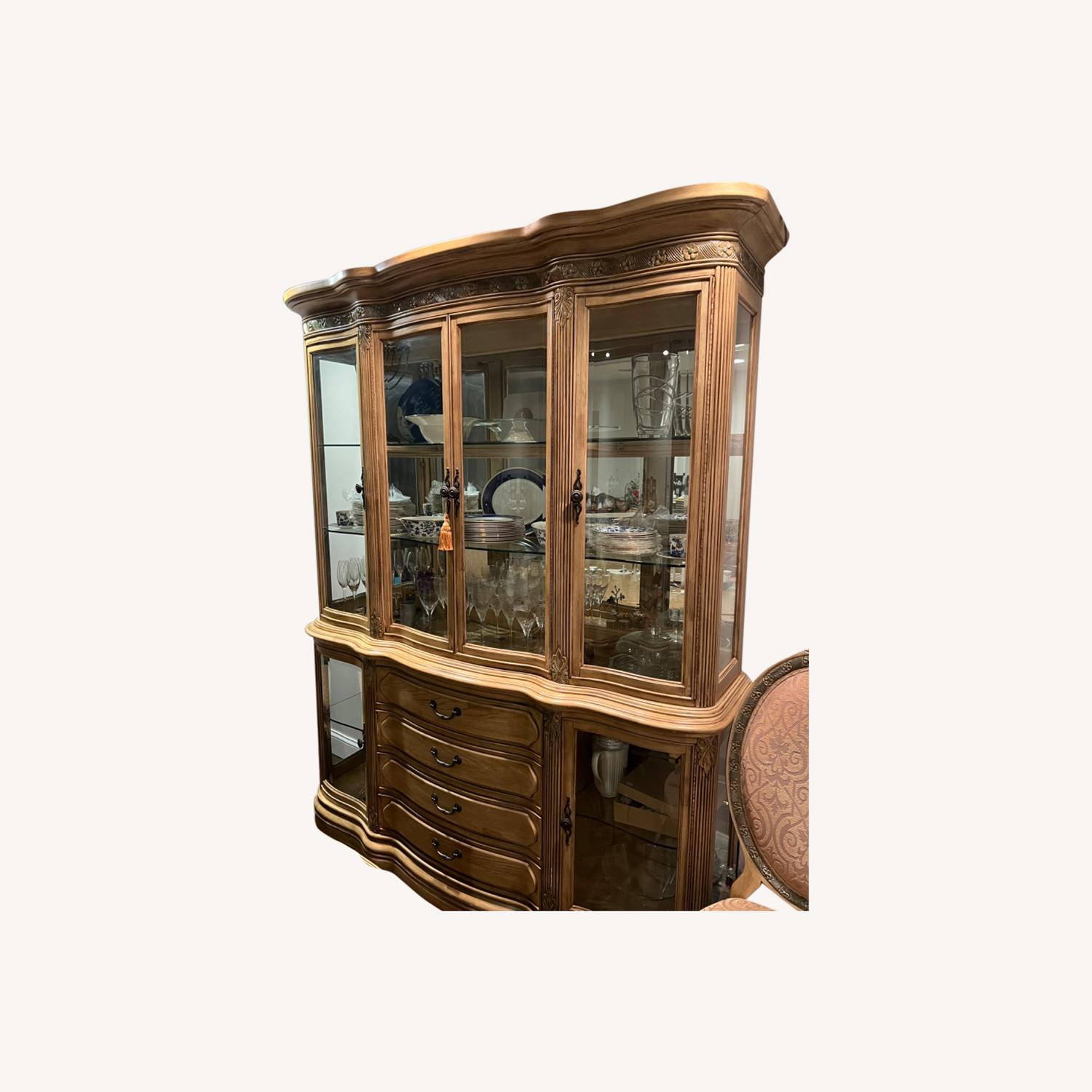 Seller's Notes:Here is a marvelous lighted China Cabinet made by AICO (Amini Innovation Corp.) It is part of the La Francaise collection. Michael Amini signature series. It is made from oak solids and ash veneers with an elegant old works crackle finish. The intricate detail makes it absolutely stunning! Additional features include floral carvings throughout, curved and beveled glass shelves, mirrored back and lighted top cabinet, serpentine front, solid brass hardware, all felt lined drawers, Anti-tarnish silverware holder, and heavy duty ball-bearing drawers. With this set, you are not actually paying for the brand name, you are paying for the quality material and craftsmanship. This high end furniture is highly sought after by interior designers. This set is in great condition and will last you years and years. I have the matching table and chairs and will sell together