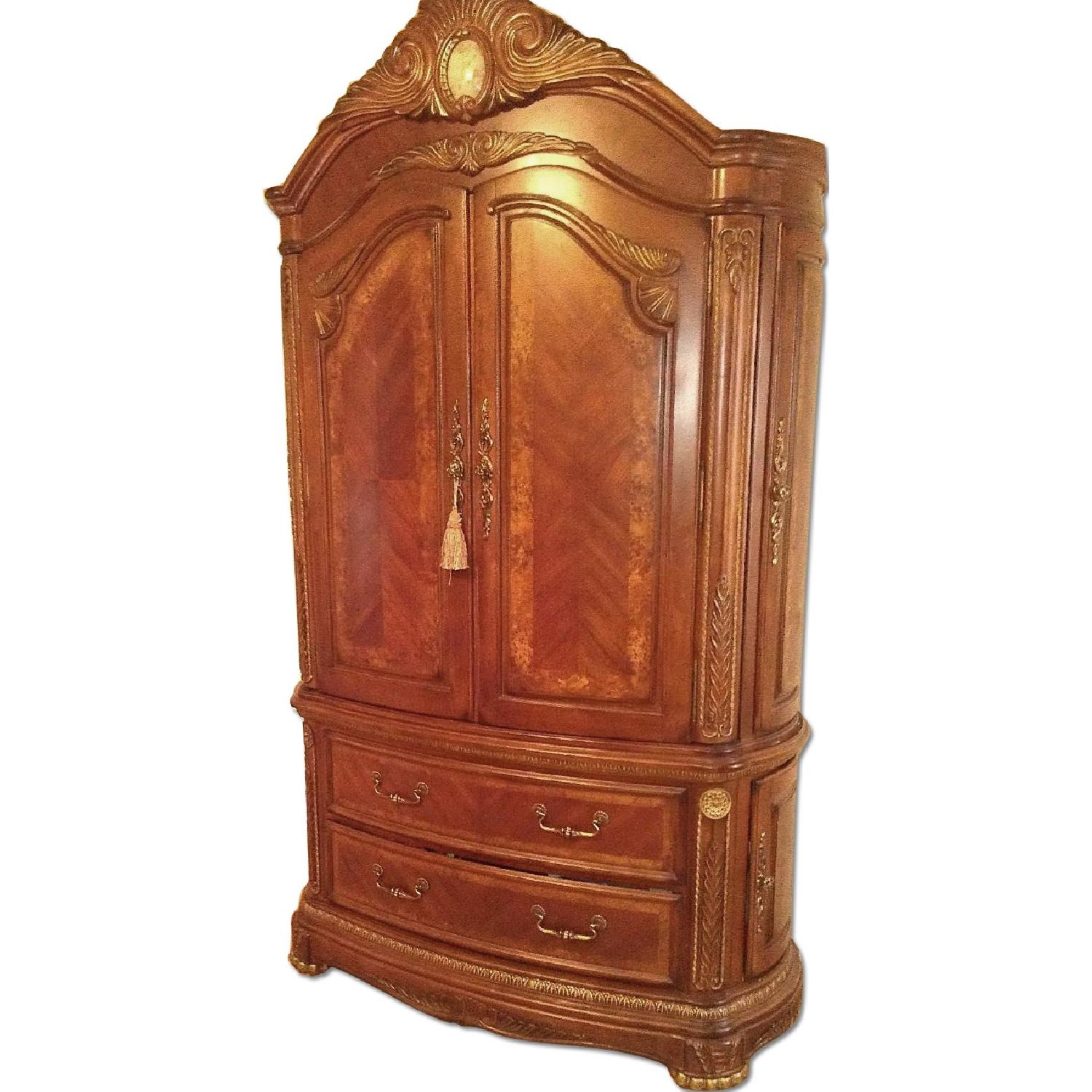 Seller's Notes:-Stunning Michael Amini AICO Cortina Bedroom Armoire piece for sale!! -Excellent condition! Retails at stores like Raymour & Flanagan for over $2300!! -Top shelf for clothing/storage, fits up to 32" flat screen comfortably with compartments for DVD player and cable box. Two deep drawers below for clothing, etc. -Four side compartments open for storage of ties, scarves, belts, watches, etc. -Also selling matching dresser with mirror, and chest of drawers under separate listing. Dimensions are: Height: 7'8" at highest point Depth: 1'11" (almost 2 ft) Width: 52" across -Honey Walnut color with gold accents and pink marble oval piece in top center.