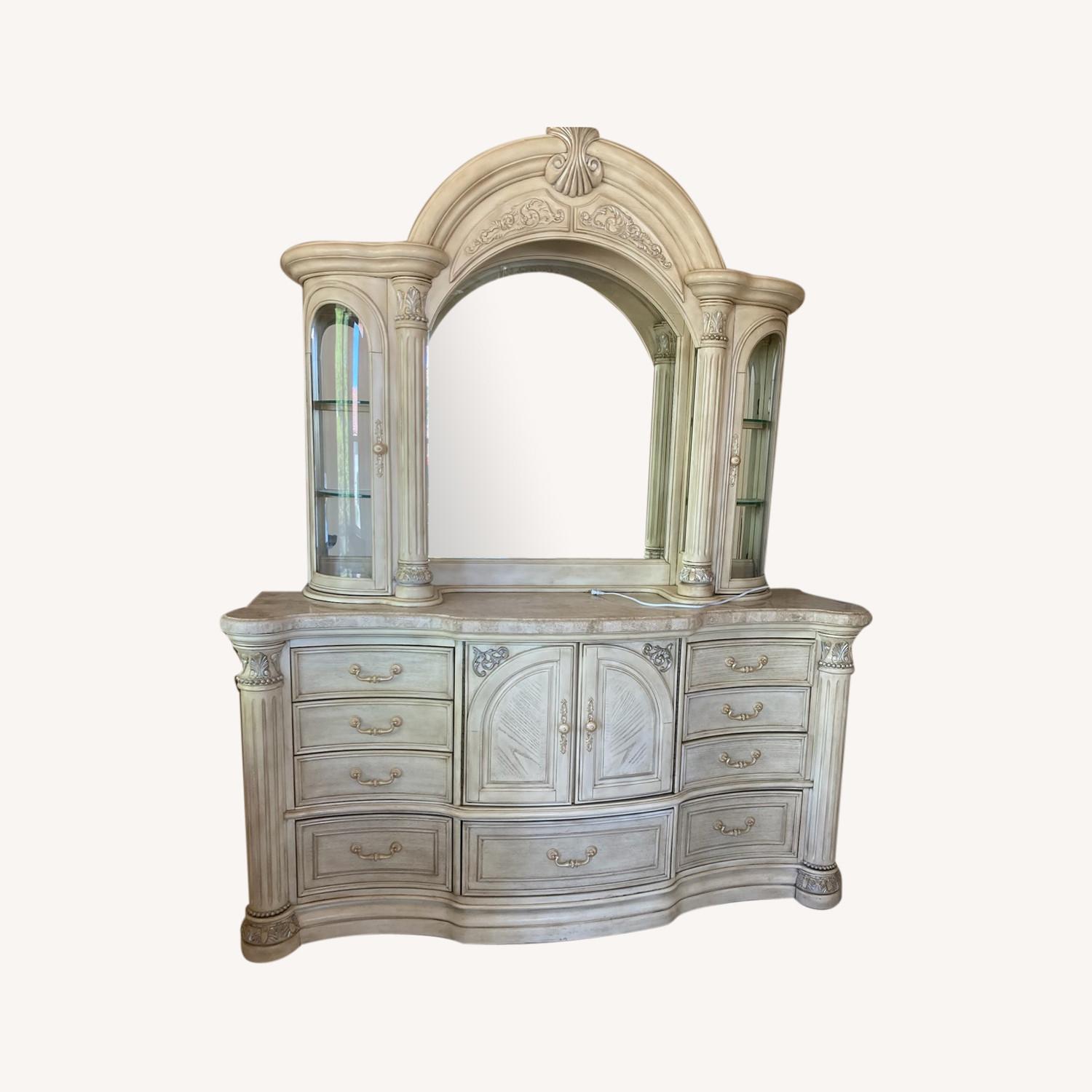 Seller's Notes:Michael Amini furniture collection solid wood with marble top dresser with 11 drawers including double door storage area came with ‘ monte Carlo’ bedroom set barely used in excellent condition color is “ silver snow’ it’s a Beautiful Mediterranean design creamy color will take best offer there’s a picture of the Michael Amimi symbol on inside of drawers