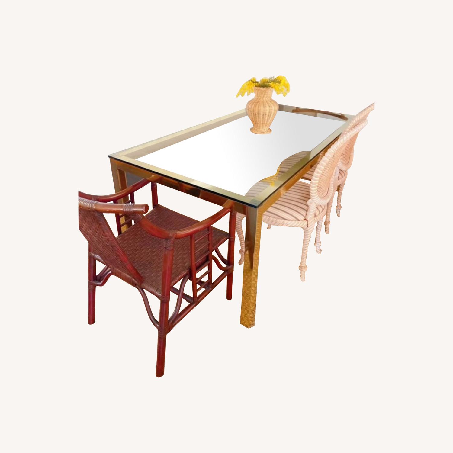 Seller's Notes:Mid 70's Milo Baughman Style Chrome and Glass Modernist Dining Table