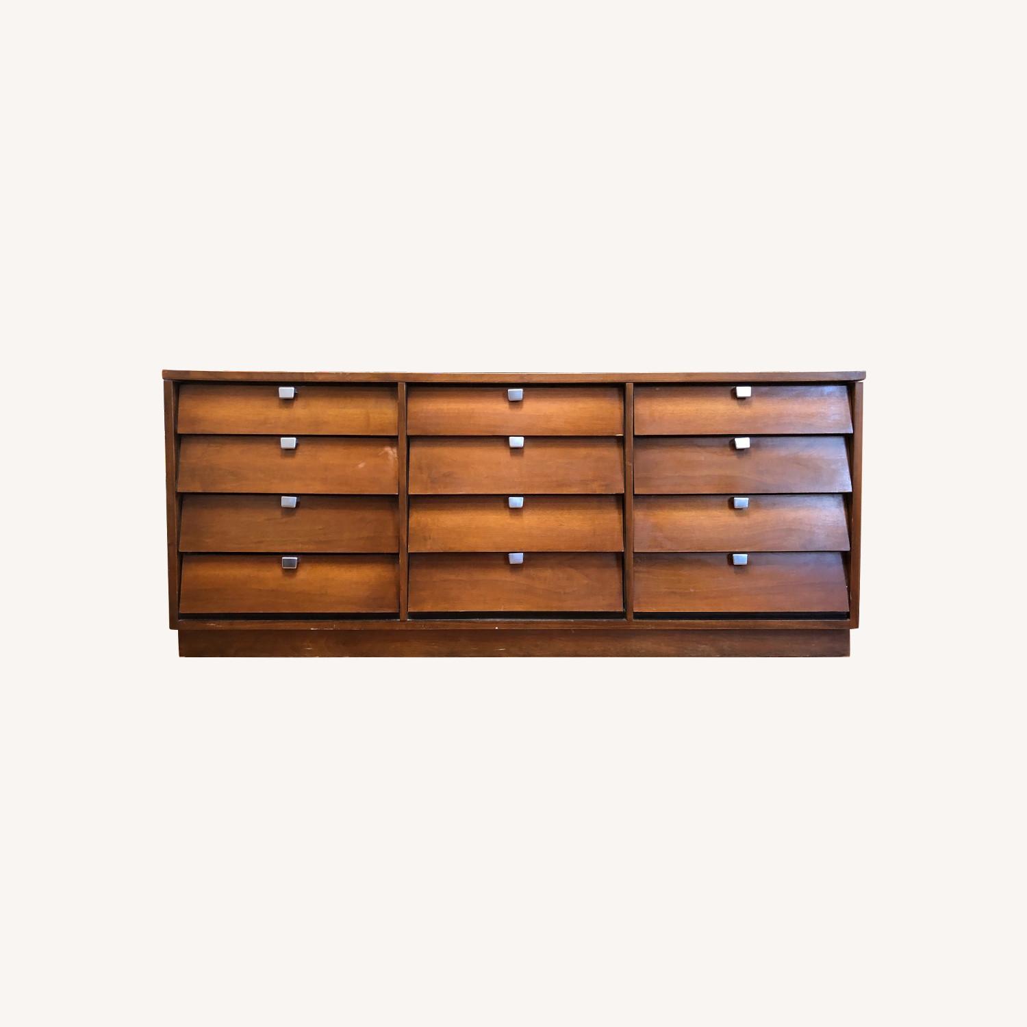 Seller's Notes:This is a beautiful original mid century dresser from the 1960s. I do not know anything about the maker. The dresser is solid teak wood and solid wood constructions but please note the top and sides have wood laminate on top of the wood, this is hardly noticeable. The wooden drawers and hardware are beautiful and has plenty of storage. The entire construction, drawers are solid wood, so this is a very heavy item, approx 150 lbs? Note it took three men to get it up the stairs the last time we moved, so if you do pick it up yourself, you will need professional movers. But it is beautiful and completely worth it. For our home, it has doubled as a dresser and a TV stand as you can see in the photos. There are a few blemishes, but this dresser still looks great. Thanks!