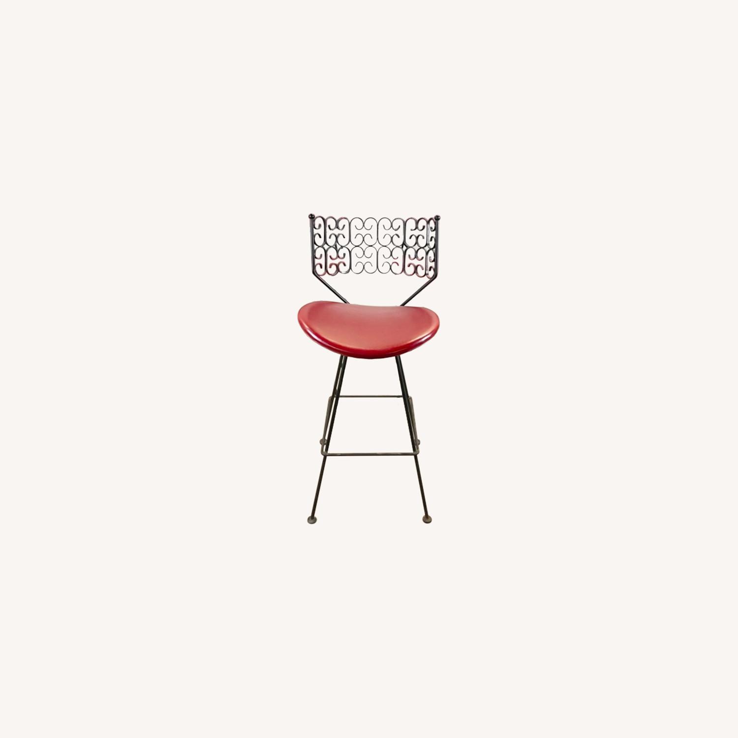 Seller's Notes:This impressive set of nine swivel barstools from Arthur Umanoff for Howard Shaver furniture features impressive scrolled details in the vintage ironwork frames. The comfortable proportions of the matching set make these a stylish and versatile addition to any bar seating area. Manufacturers label under seat- available as sets of 3 as well- contact seller for details Dimensions: 19w 19d 41.5h 30sh Condition: age appropriate wear, vintage finish worn, scuffs/scratches, edge wear, fabric worn, minor tears, some losses, swivel.sticks in area, see photos for details.