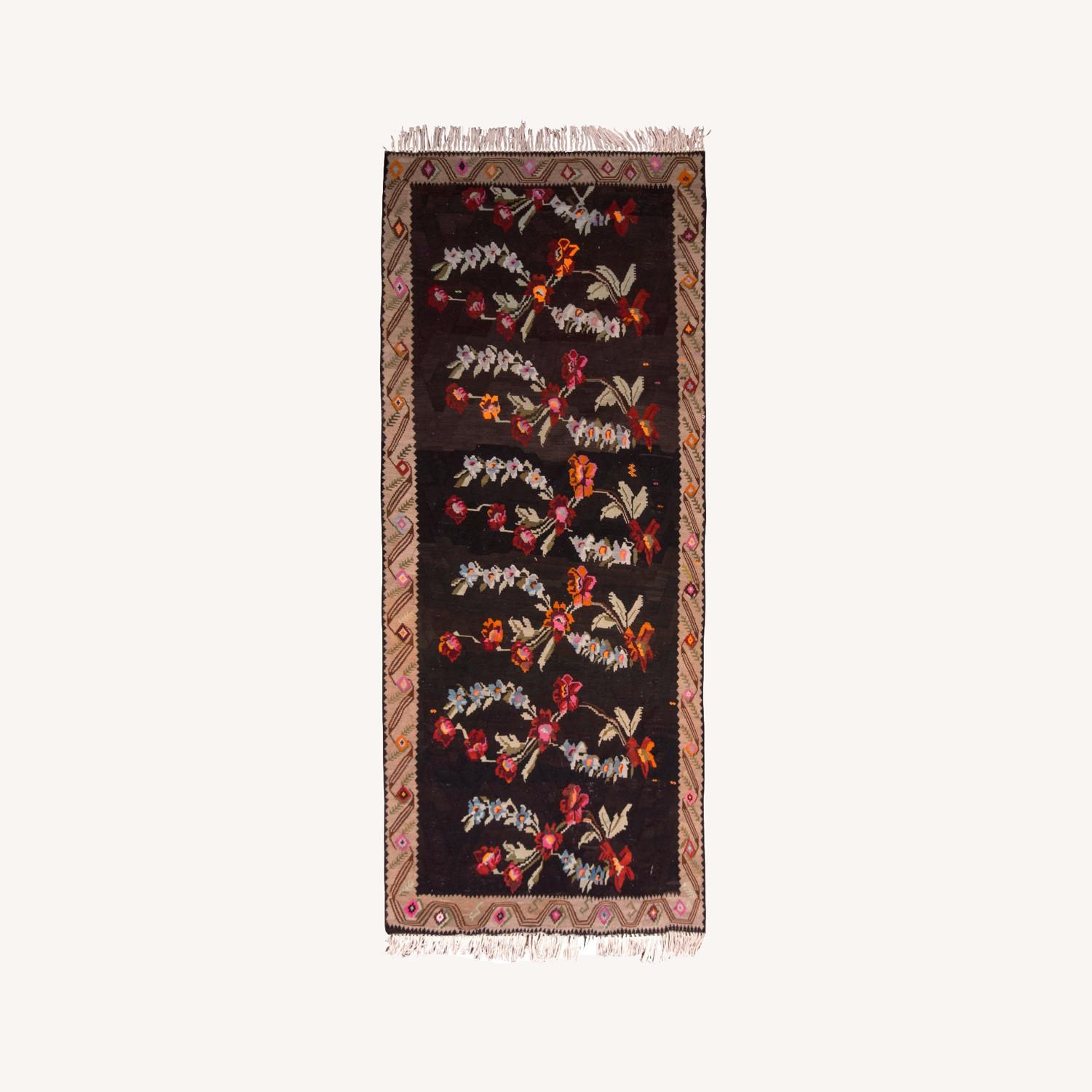 Seller's Notes:This vintage Turkish flat-weave kilim rug features a Bessarabian style, whose origins are traced to Romania and select European styles. Handmade with flat woven wool circa 1950-1960, this particular mid-century Bessarabian kilim features seven delicate floral arrangements laid out on a black background, which features splashes of brown placed horizontally as faint stripes throughout the piece. The vertical placement of these flowers shows the same florals in each arrangement with varying tones in their colors, reading graceful in juxtaposition to the earth tones remarking the skill of the weaver employing these yarns with meticulous detail. This vintage Turkish flat-weave kilim rug also features a border of beige, upon which flowers in red, blue, brown, pink, red, and orange are laid. These equally elegant flowers are accentuated by small green leaves and brown vines. Measuring 5’6 x 12’8, this piece would complement the space at the foot of the bed inside a bedroom among its many possibilities in this versatile size and sensibility.