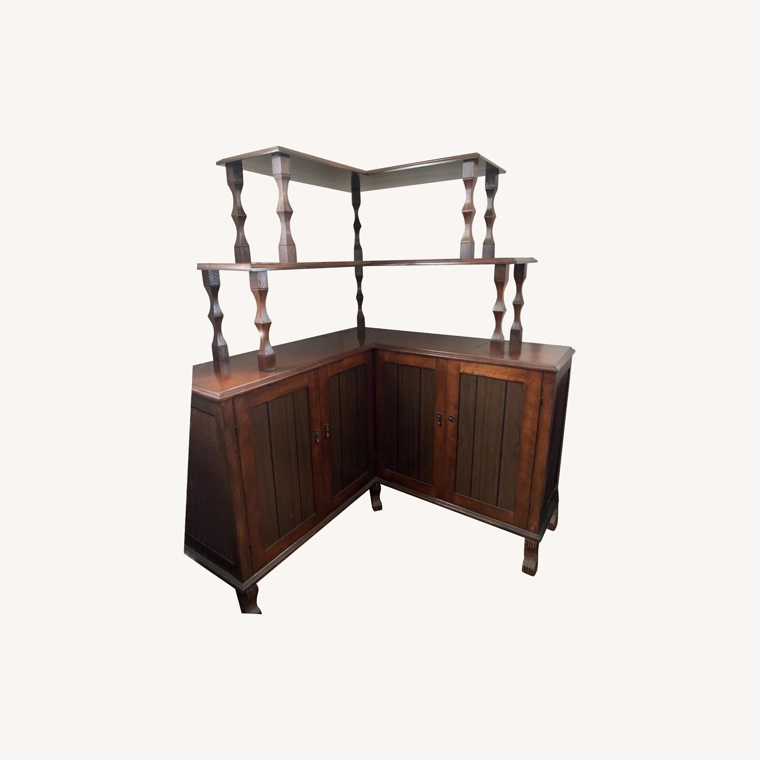 Seller's Notes:Price reduction- This is a corner book shelf and storage cabinet with an old Commodore stereo on one side of the cabinet which can be used (not tested) or removed. This was purchased by my grandparents in 1953 when they moved to Nutley. Still in excellent condition with original finish. There are some black marks on the shelf which may come off. missing part of one pull. the shelving is lovely.