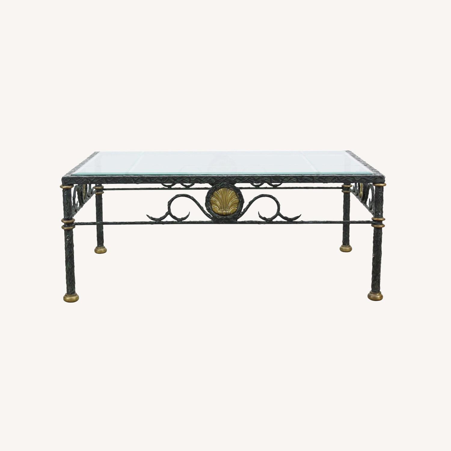 Seller's Notes:Stunning metal coffee table with brass accent, this lovely table is in great vintage condition. Dimensions; 41" Width x 27"Depth x 16"Height. The glass top has a chip on the corner see picture for details. If you have any question, please let me know, thank you.